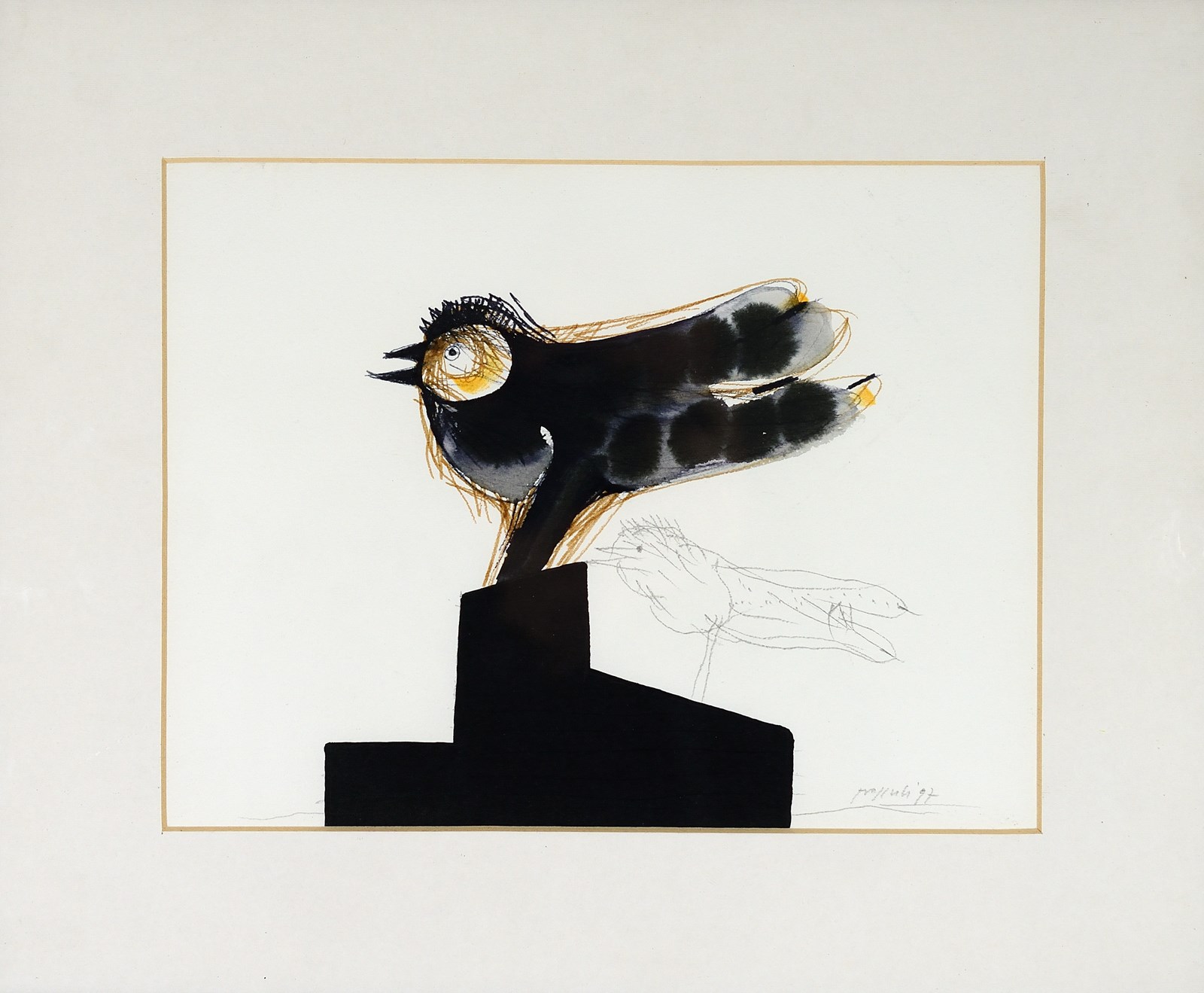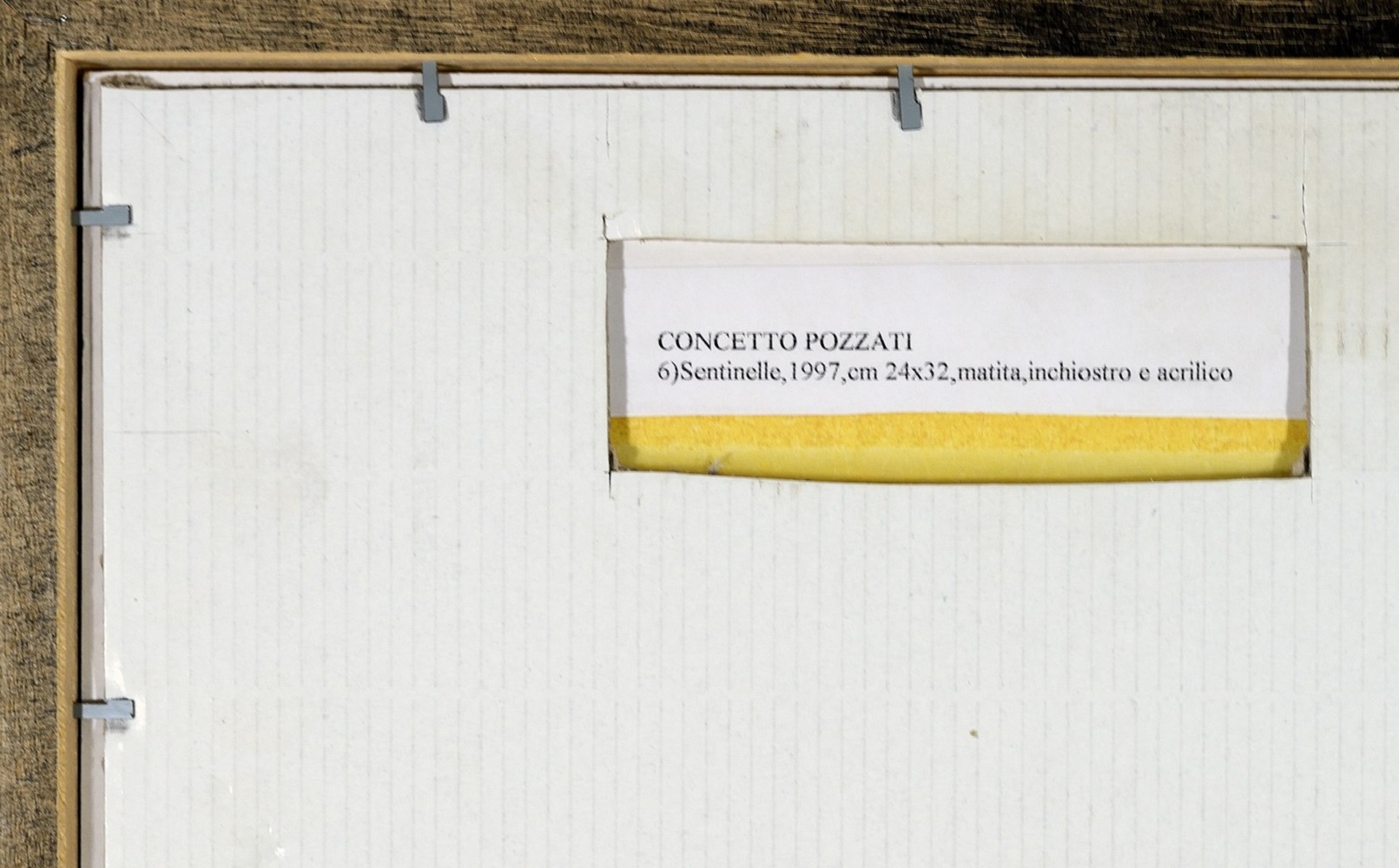 POZZATI CONCETTO (n. 1935) Sentinelle. 1997. china/inchiostro su carta. Cm 32,00 x 24,00. Firma e anno in basso a destra. Certificato di autenticità Meeting Art, Vercelli. Cornice presente