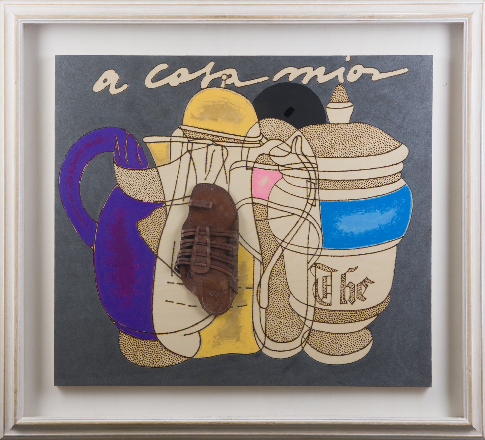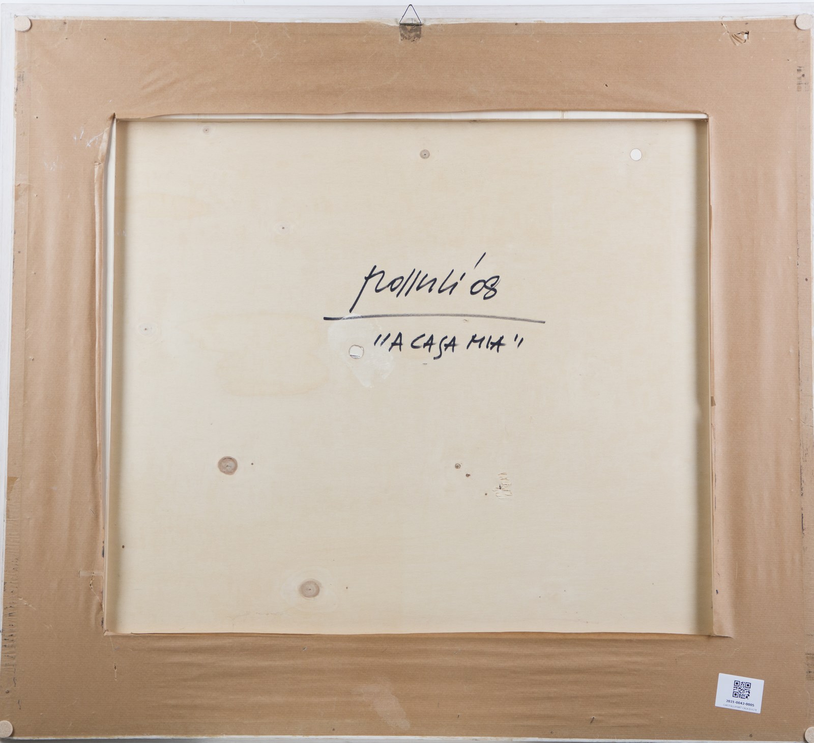 POZZATI CONCETTO (n. 1935) A casa mia. 2008. Tecnica mista su tavola. Cm 80,00 x 70,00. Titolo in alto al centro. Al retro titolo, firma e anno. Opera archiviata presso la Fondazione Concetto Pozzati, Cesena, come da documentazione fotografica allegata all'opera riportante il relativo numero d'inventario. Pubblicazione: A Casa Mia, Edizioni C. Maretti, a cura di Francesco di Leo, Sala dei Battuti del Duomo a Conegliano, Treviso, 2008, p.73. Provenienza: Viol@rte Arte Contemporanea, Magenta. Cornice presente