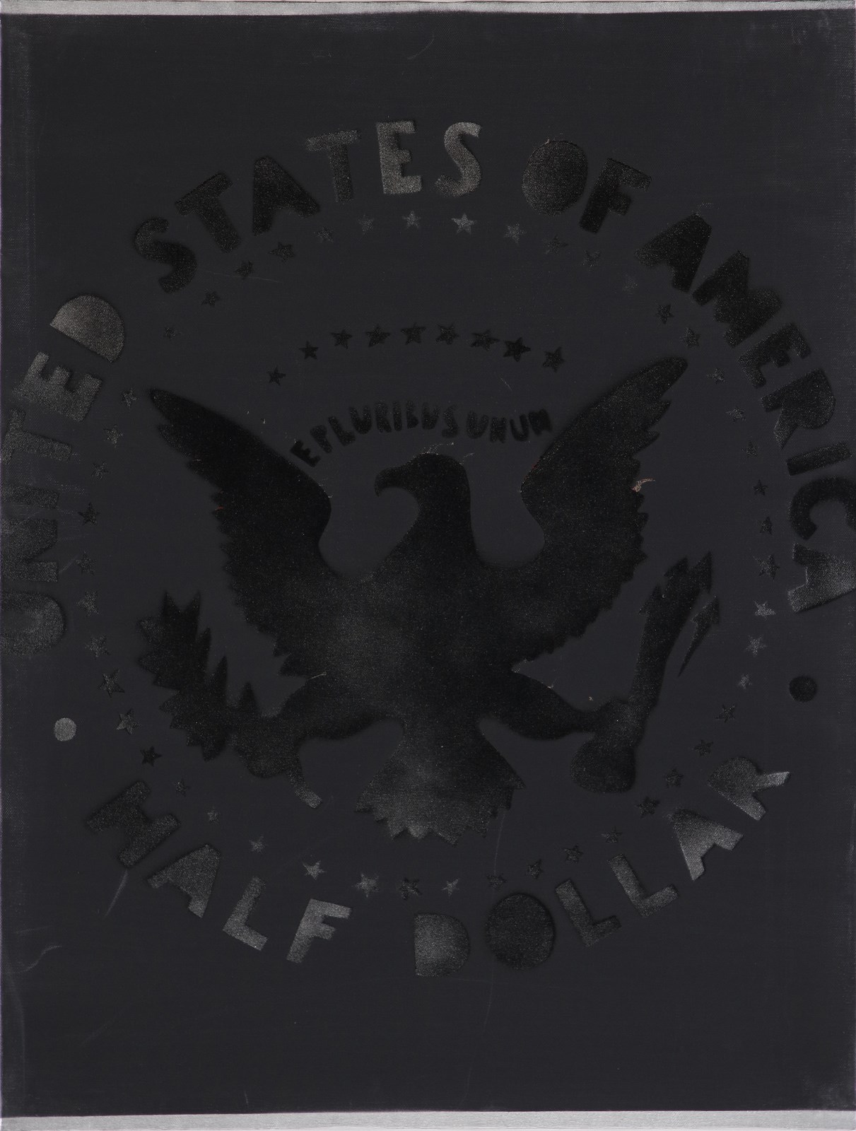 ANGELI FRANCO (1935 - 1988) Half dollars OFA 76. Tecnica mista su tela. Cm 60,00 x 80,00. Produzione seriale. Firma al retro. Opera archiviata presso l'Archivio Franco Angeli, Roma, come da documentazione fotografica allegata all'opera riportante il relativo numero d'inventario. Anni'80