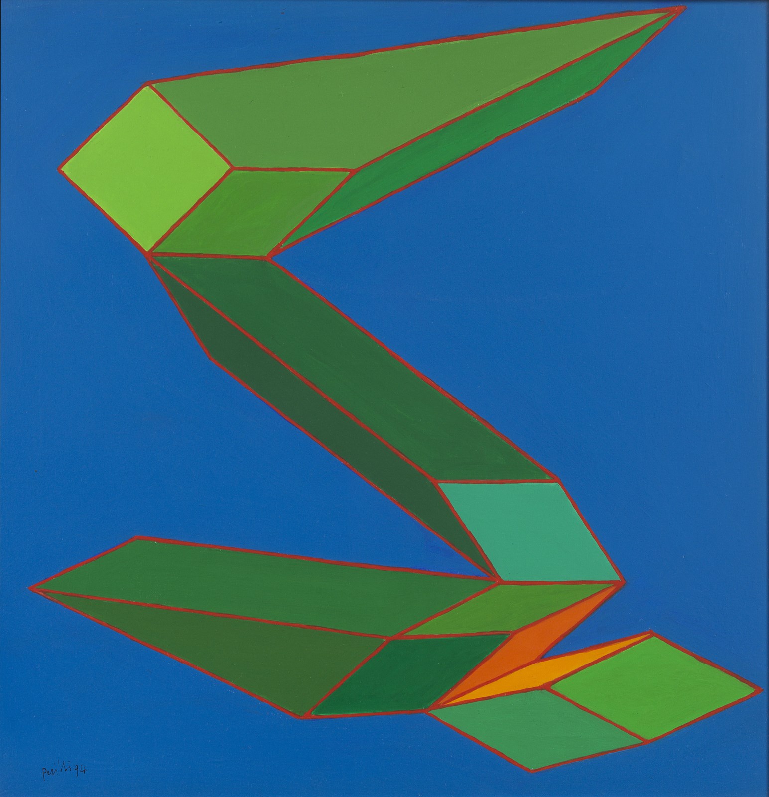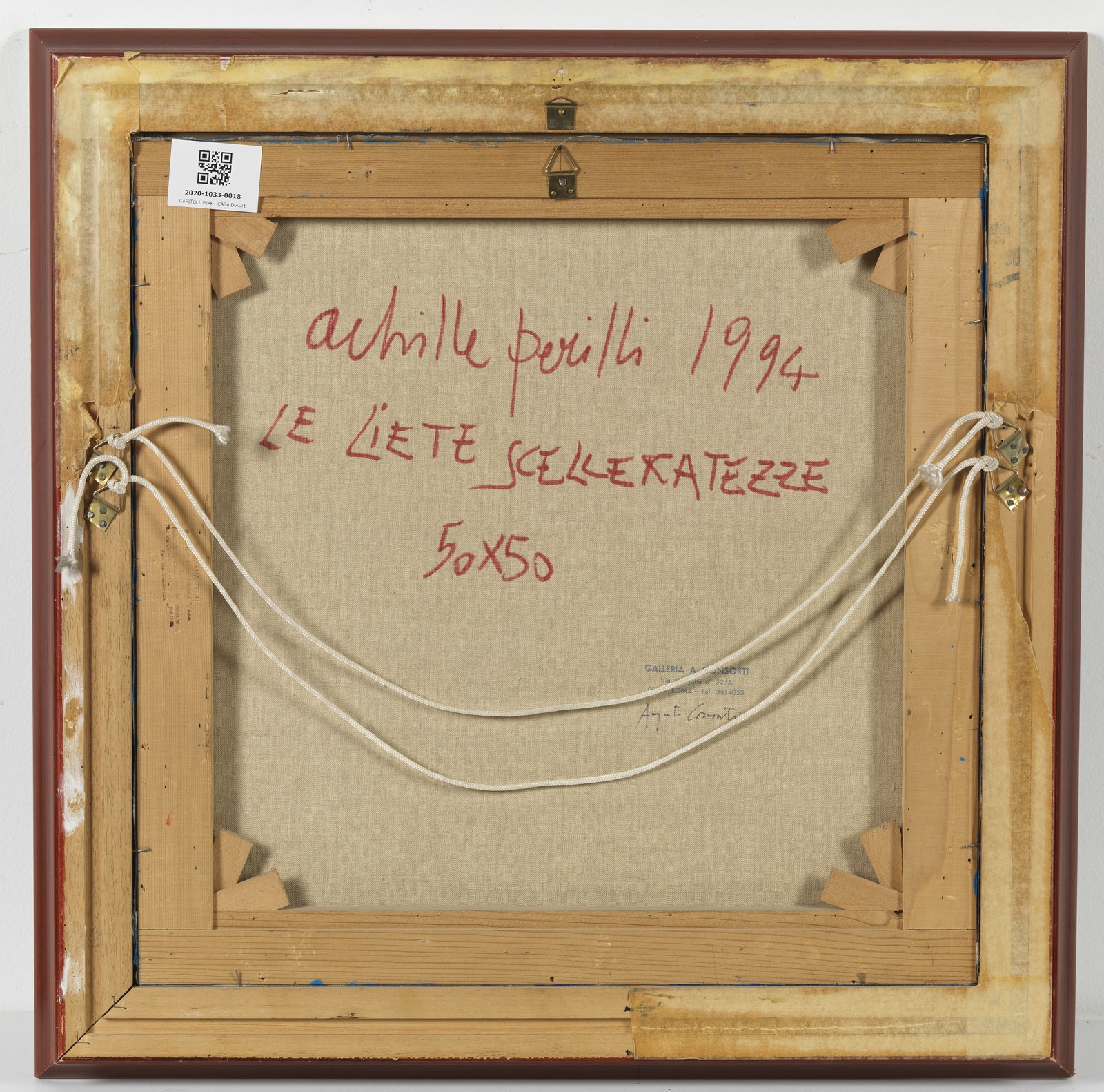 PERILLI ACHILLE (n. 1927) Le liete scelleratezze. 1994. Olio su tela . Cm 50,00 x 50,00. Firma e anno in basso a sinistra. Al retro titolo, firma, anno e timbro della Galleria Consorti, Roma. Autentica dell'artista su fotografia riportante il relativo numero d'inventario. Pubblicazione: Catalogo generale delle opere e delle sculture di Achille Perilli 1945-2016 a cura di Giuseppe Appella, Silvana Editoriale, 2019, pag. 301, ill.1966. Cornice presente