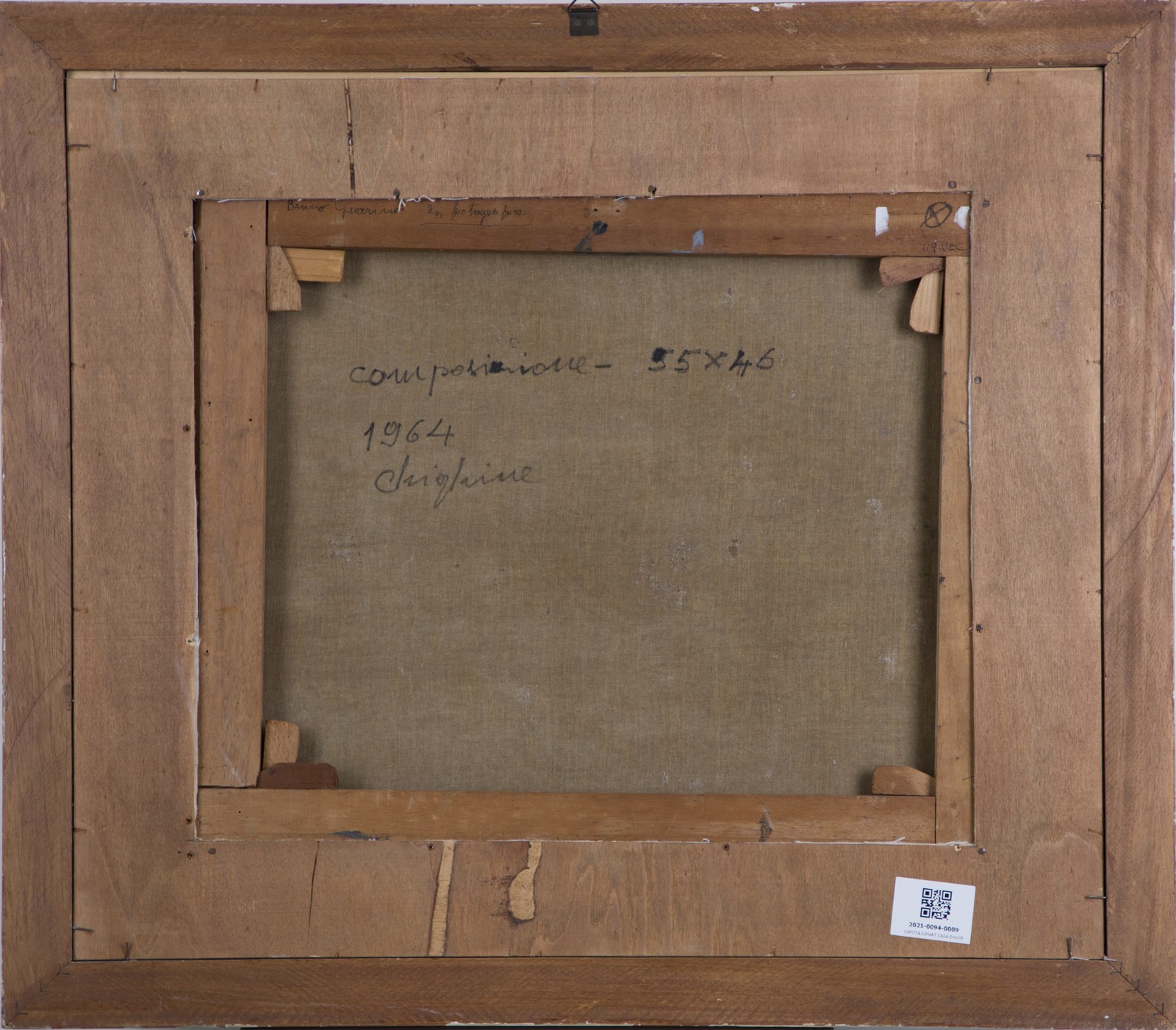 CHIGHINE ALFREDO (1914 - 1974) Composizione. 1964. Olio su tela . Cm 55,00 x 46,00. Al retro titolo, firma e anno. Pubblicazione: Catalogo ragionato delle opere di Alfredo Chighine, 2019, Milano, con numero di archivio: 263 (tecnica errata). Lievi difetti. Cornice presente