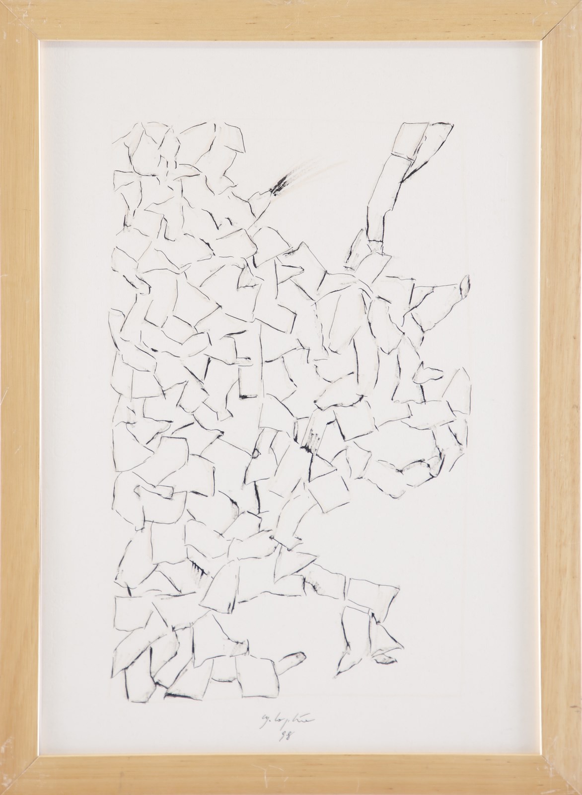 LA PIETRA UGO (n. 1938) Senza titolo. 1998. Tecnica mista su carta. Cm 35,00 x 50,00. Firma e anno in basso al centro. Filigrana Fabriano in alto a sinistra. Cornice presente