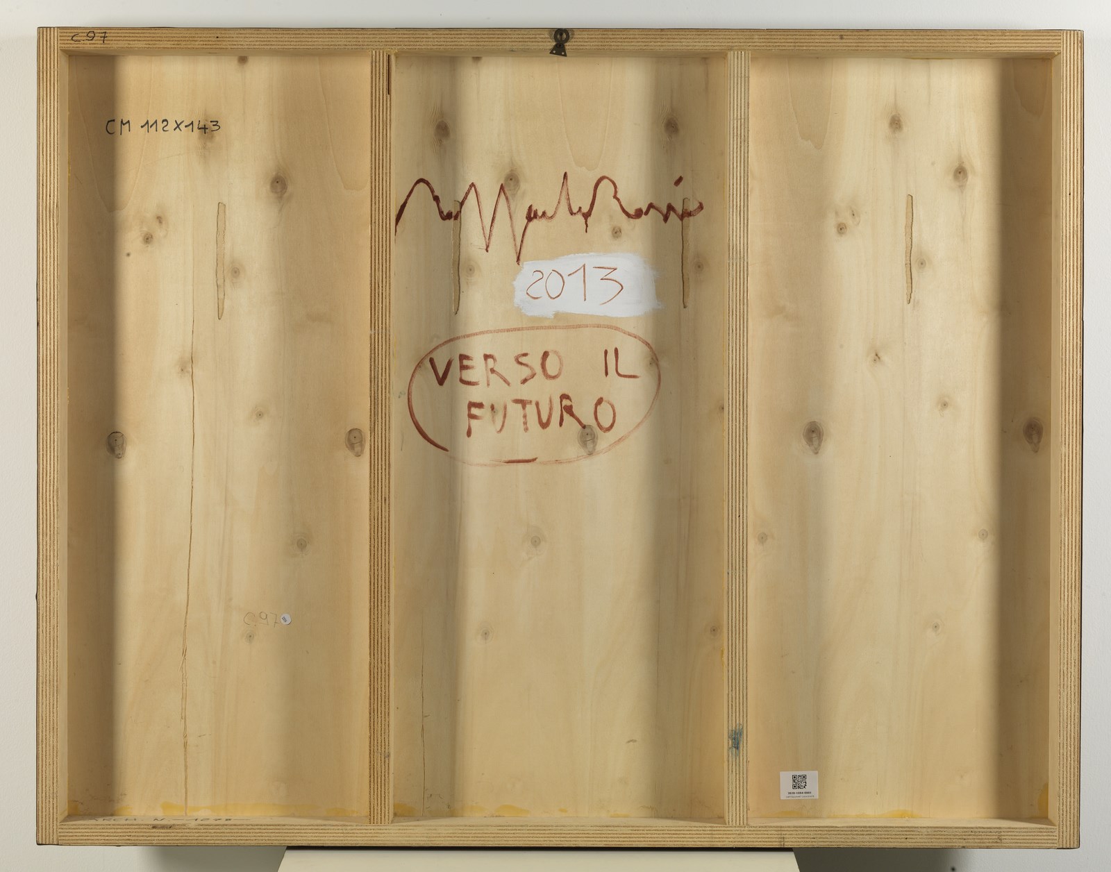 ROSSI RAFFAELE (n. 1956) Verso il futuro. 2013. Tecnica mista su tavola. Cm 142,00 x 112,00 x 8,00. Al retro titolo, firma e anno. Autentica dell'artista su fotografia riportante il relativo numero d'inventario.