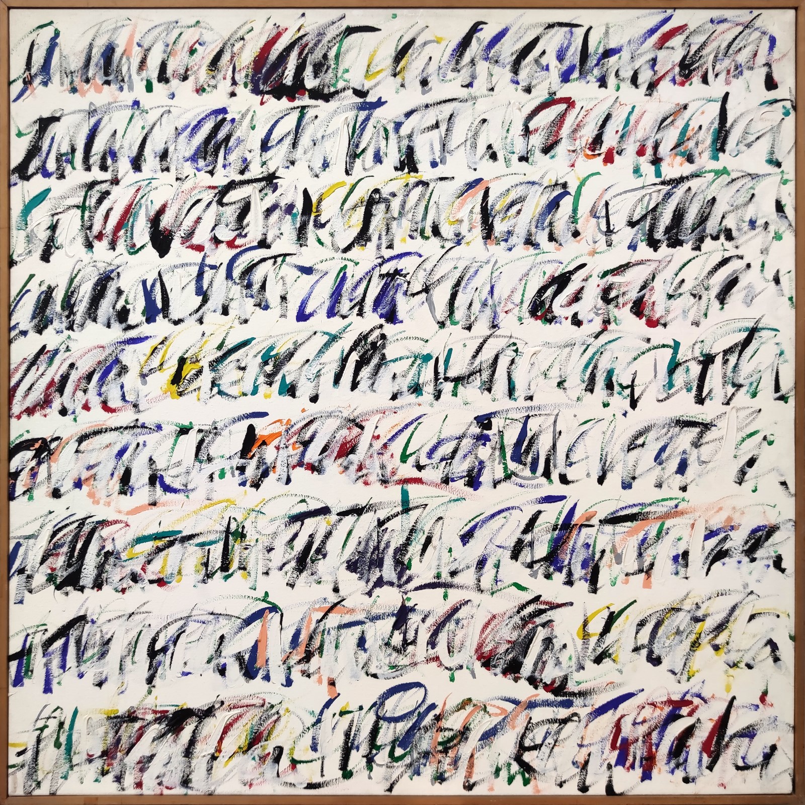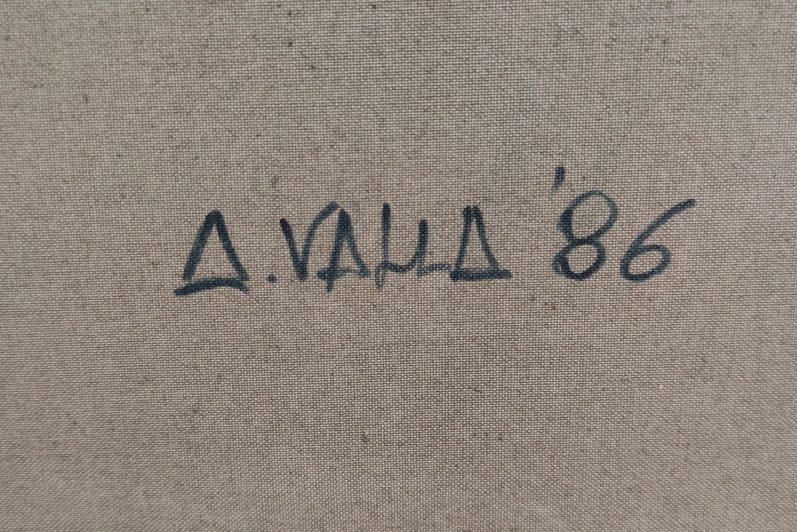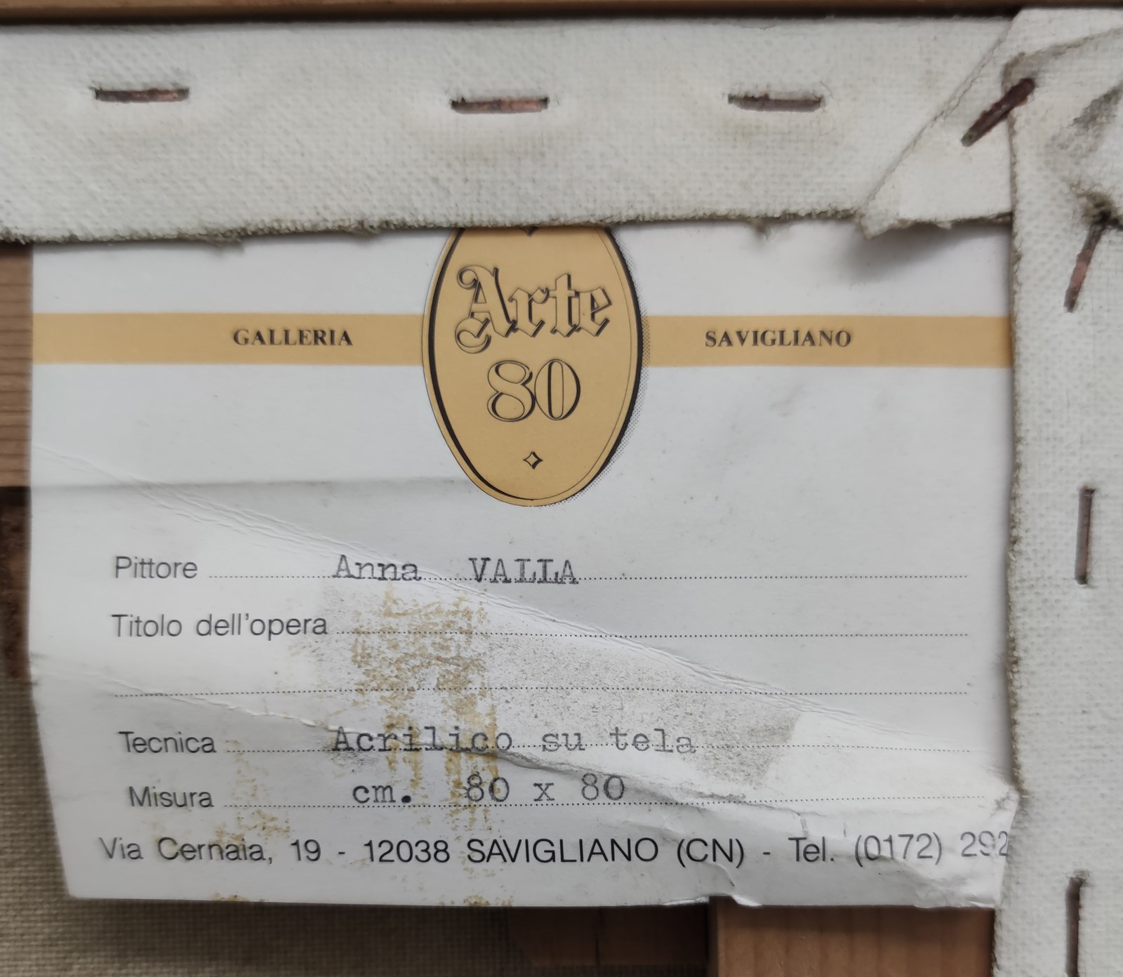 VALLA ANNA (n. 1951) Senza titolo. 1986. Olio su tela . Cm 80,00 x 80,00. Firma e data al retro. Al retro cartiglio Galleria D'Arte, Savigliano. Cornice presente