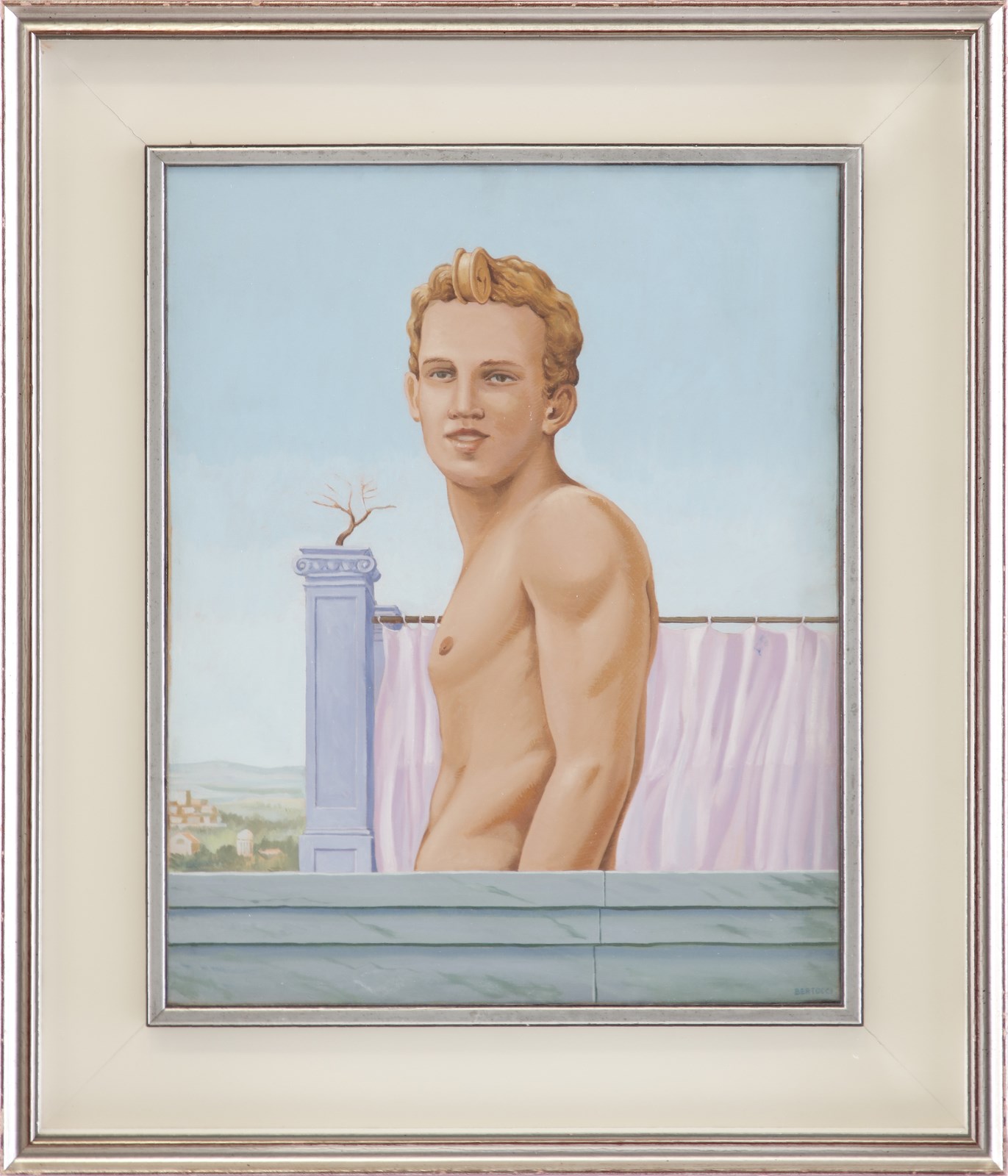 BERTOCCI CARLO (n. 1946) Teatrino d'albicocca. 1984. Olio su tela . Cm 40,00 x 50,00. Firma in basso a destra. Al retro titolo e firma.Timbro Galleria Bonaparte, Milano. Autentica dell'artista su fotografia.