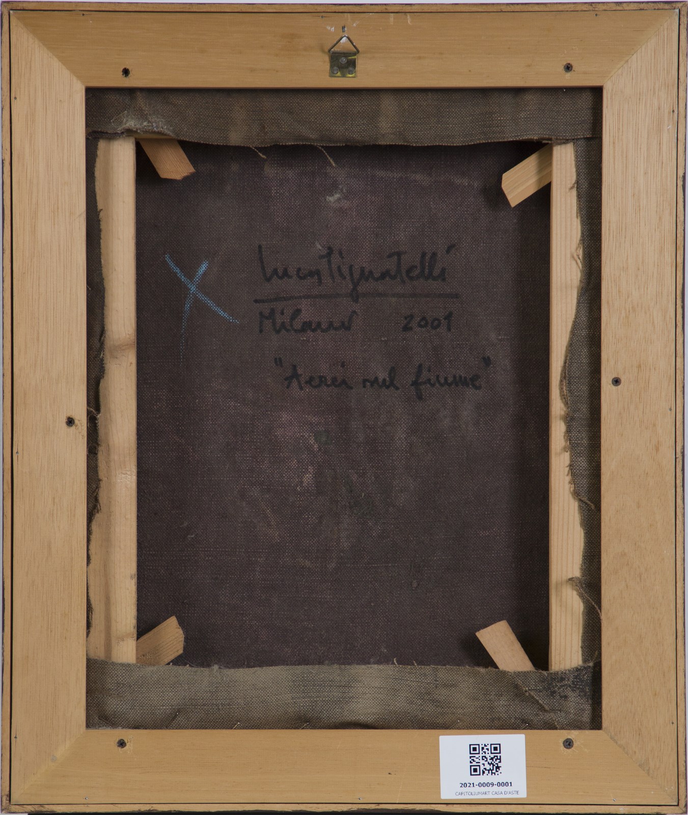 PIGNATELLI LUCA (n. 1962) Aerei nel fiume. 2001. Olio su telone di copertura di vagone ferroviario. Cm 38,00 x 46,00. Al retro titolo, firma e anno. Provenienza: Galleria Poggiali, Firenze. Collezione privata, Firenze. Autentica dell'artista su fotografia.