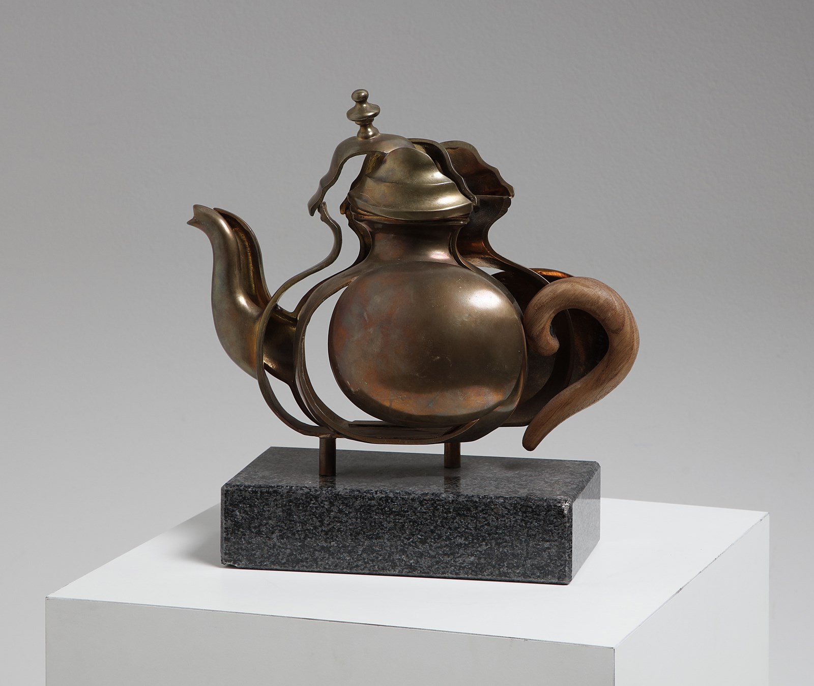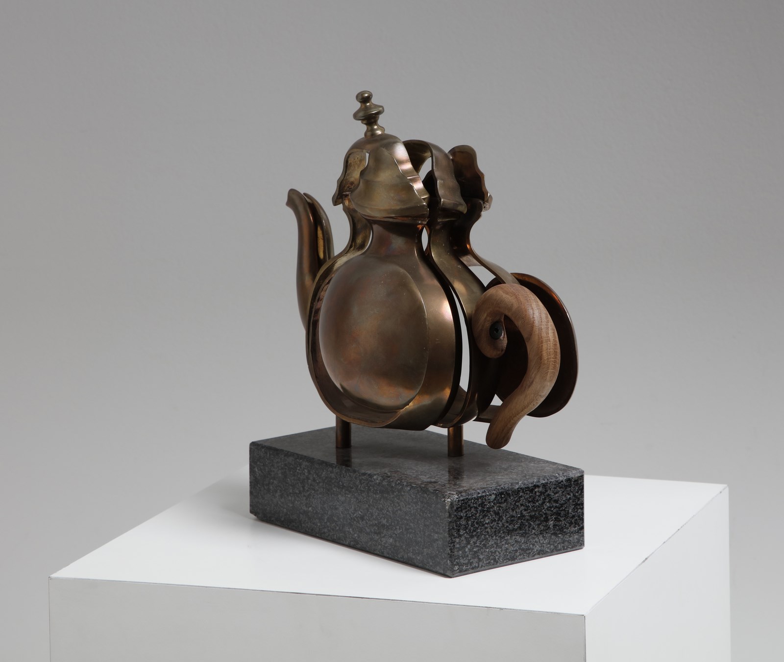ARMAN FERNANDEZ (1928 - 2005) Tea for Two. 1985. Bronzo e marmo. Cm 35,00 x 30,00 x 16,00. 44/100. Firma e tiratura incise in basso. Edizione totale: 100 esemplari numerati da 1/100 a 100/100 + Ap. Base in marmo leggermente sbeccata sugli angoli.