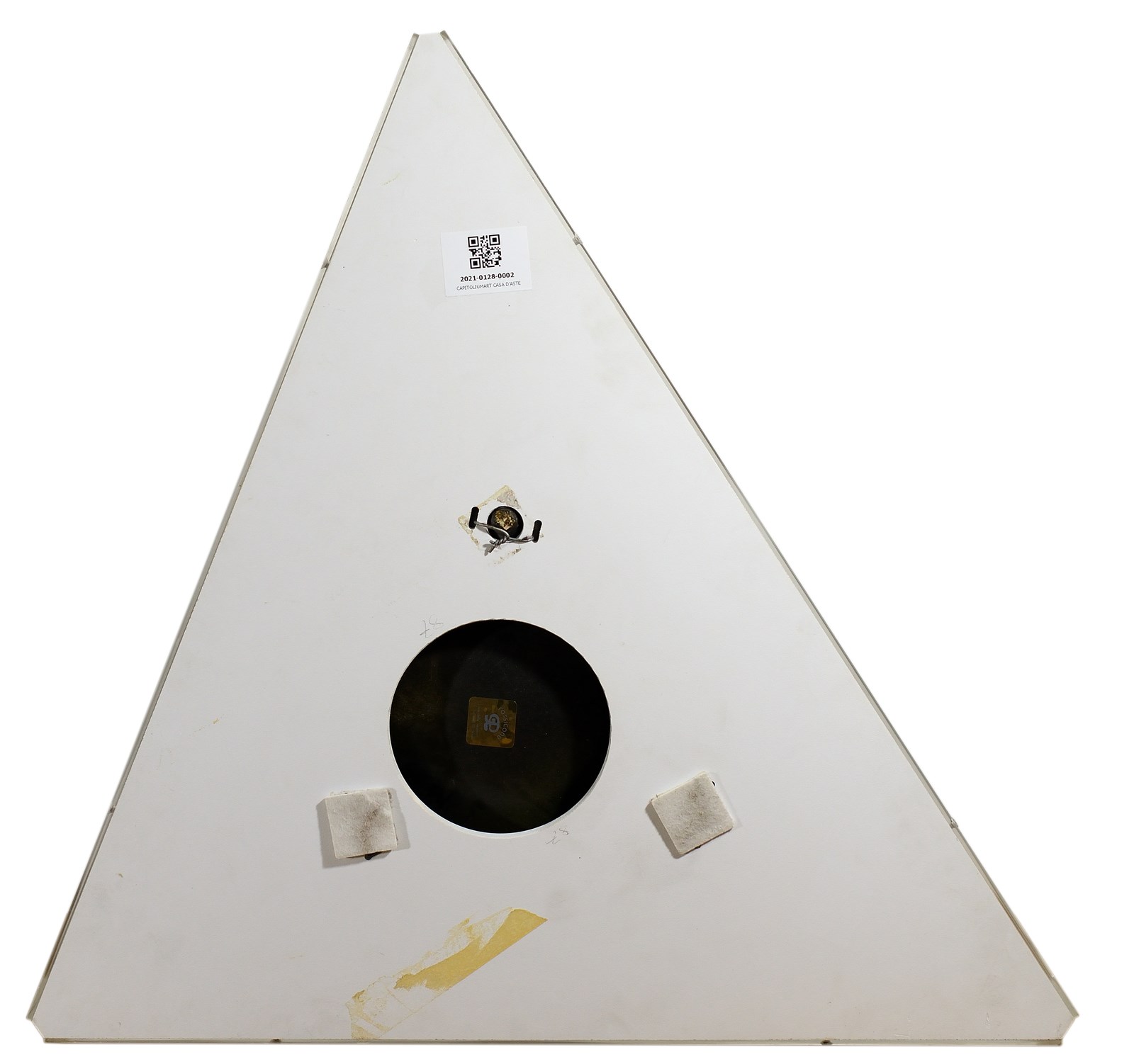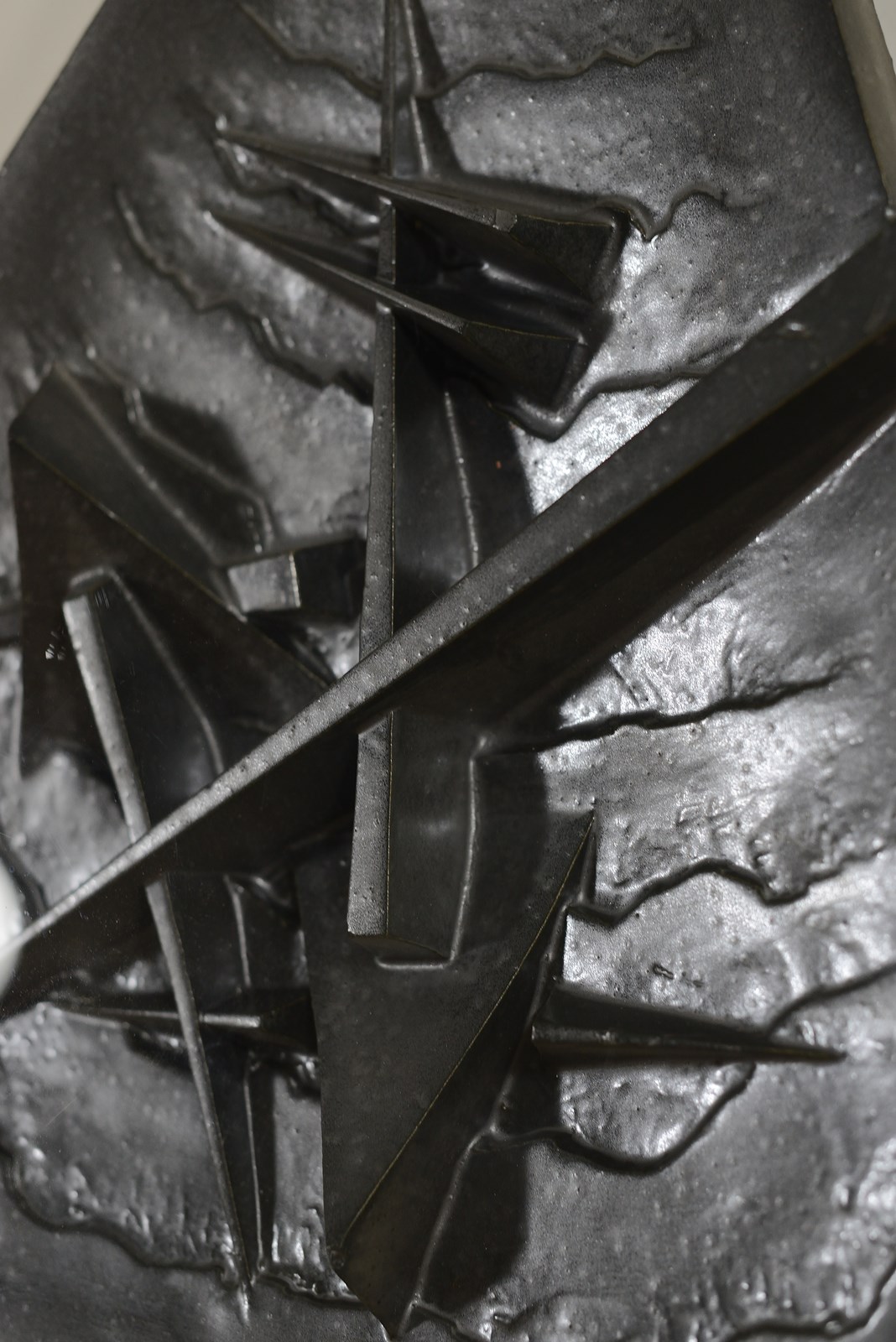 POMODORO ARNALDO (n. 1926) Piatto triangolare. 2003. Gres metallizzato. Cm 59,00 x 57,00 x 64,00. 87/90. Ceramiche Rossicone, Milano. Edizione Totale: 90 esemplari numeri arabi + prove d'artista. Il piatto è stato realizzato in 3 varianti di colore: bianco, verde, nero. L'opera è registrata presso la Archivio Arnaldo Pomodoro - Sez. Multipli. Sitografia: https://www.arnaldopomodoro.it/catalogue_raisonne/artworks/detail/2140/mag01m0628-piatto-triangolare .
