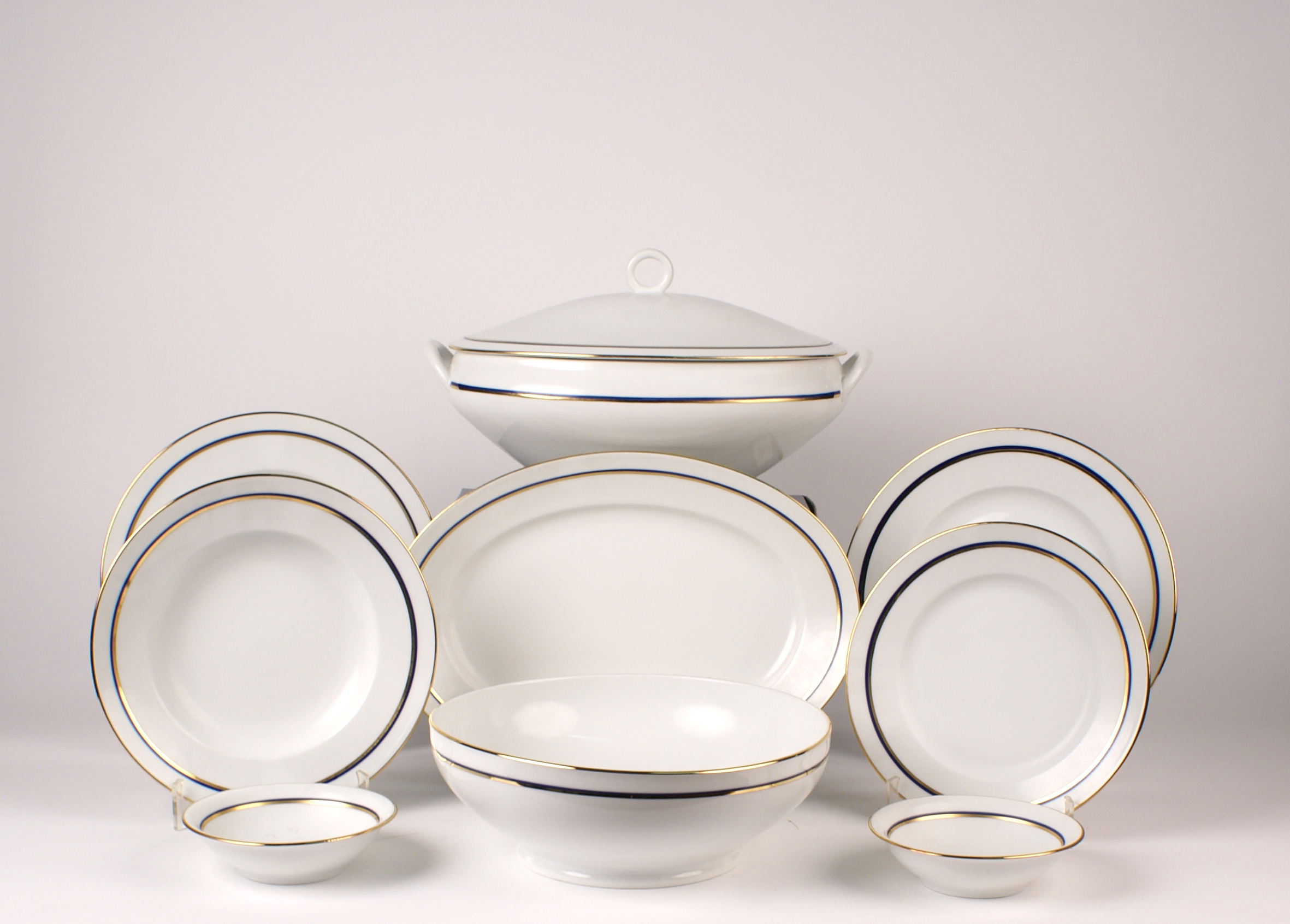 SERVIZIO DI 82 PIATTI Richard Ginori 1985 porcellana bianca profilata in oro e blu cobalto, composto da 24 piatti piani, 24 piatti fondi, 24 piatti frutta, 2 zuppiere, 2 insalatiere, 4 piatti da portata e 2 coppette