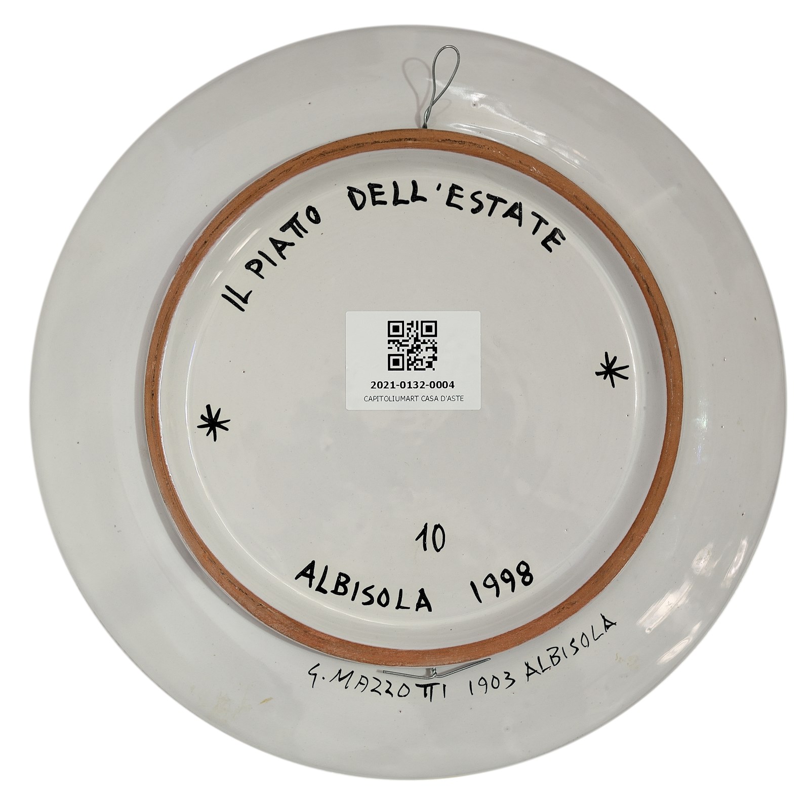 NESPOLO UGO (n. 1941) Il piatto dell'Estate. 1998. Ceramica smaltata.. Cm 30,00. Piatto in ceramica smaltata. Firma in basso. Diam. cm 30. Al retro Iscrizione Albissola, Ceramiche Giuseppe Mazzotti.