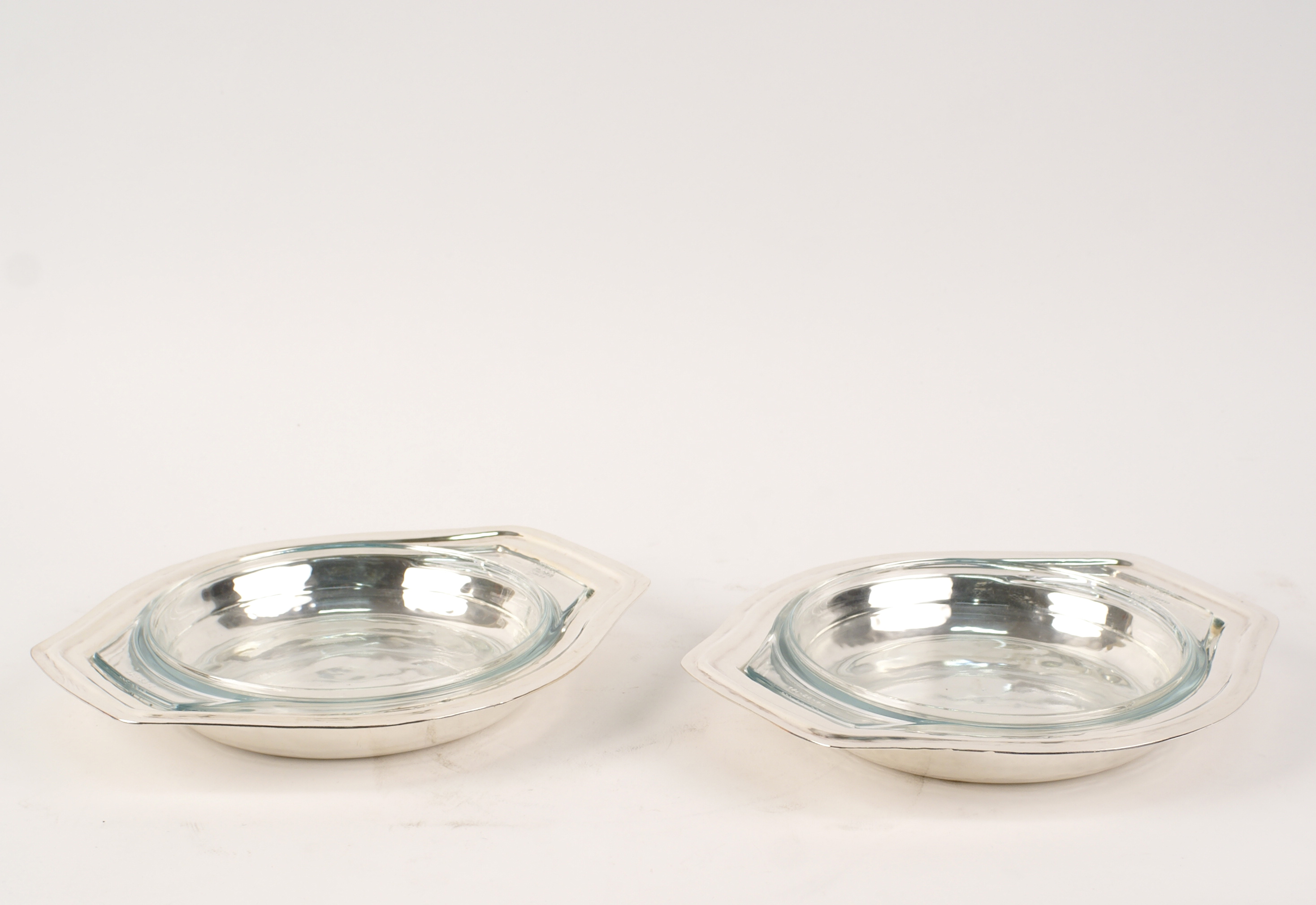 COPPIA DI TEGAMINI IN SILVER PLATE manifattura francese con interni in vetro 23x20 cm.