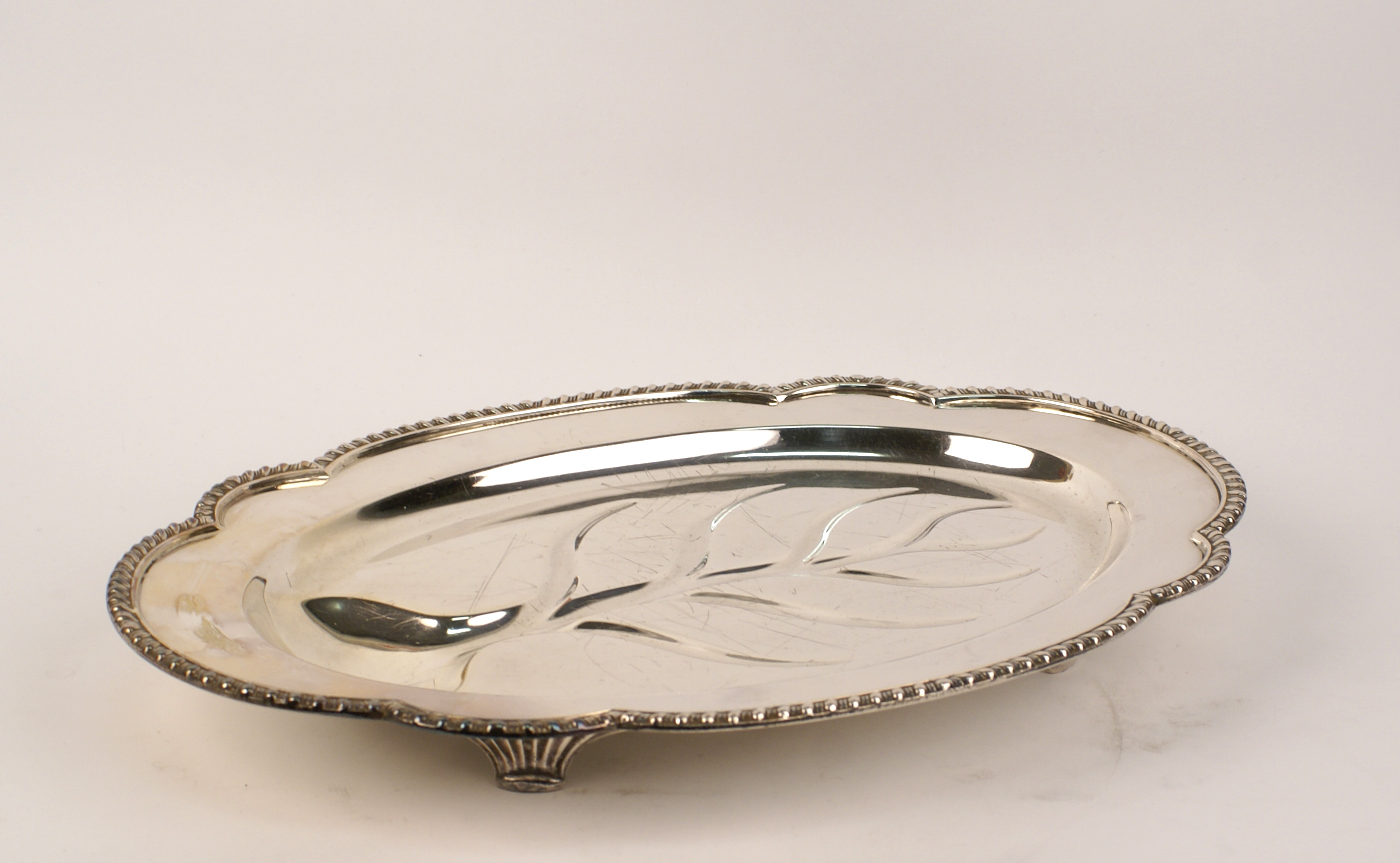 VASSOIO OVALE PER ARROSTO IN METALLO vecchia manifattura poggiante su quattro piedini 41x30 cm.