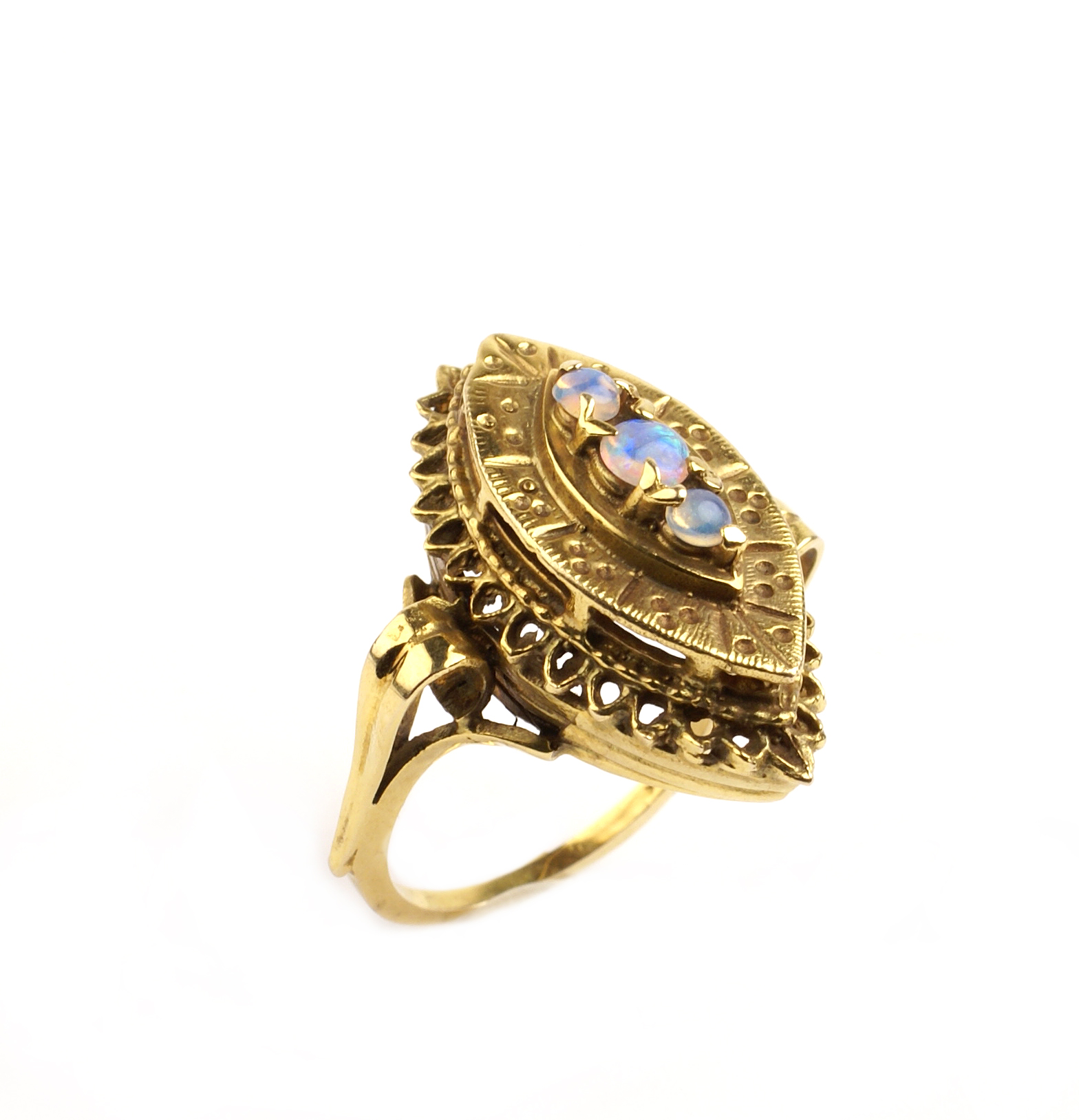 ANELLO A LOSANGA anni 50/60 in oro giallo 14kt con tre opali arlecchino, misura 12 6,7 gr.