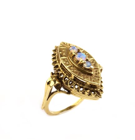 ANELLO A LOSANGA anni 50/60 in oro giallo 14kt con tre opali arlecchino,...