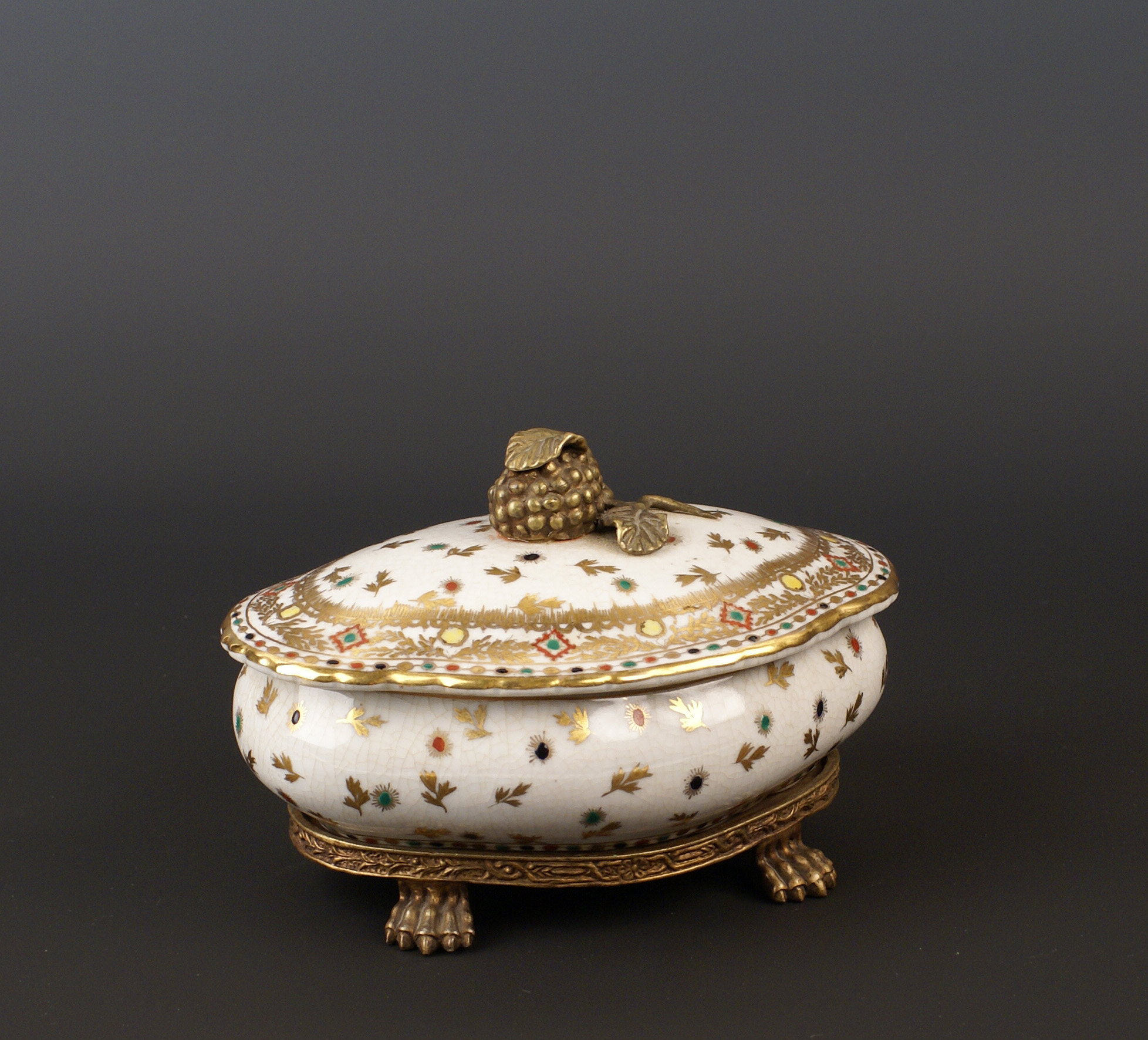 SCATOLA IN PORCELLANA BIANCA vecchia manifattura e parzialmente dorata decorata a motivo floreale, presa e base in bronzo dorato e cesellato 11x18x13 cm.