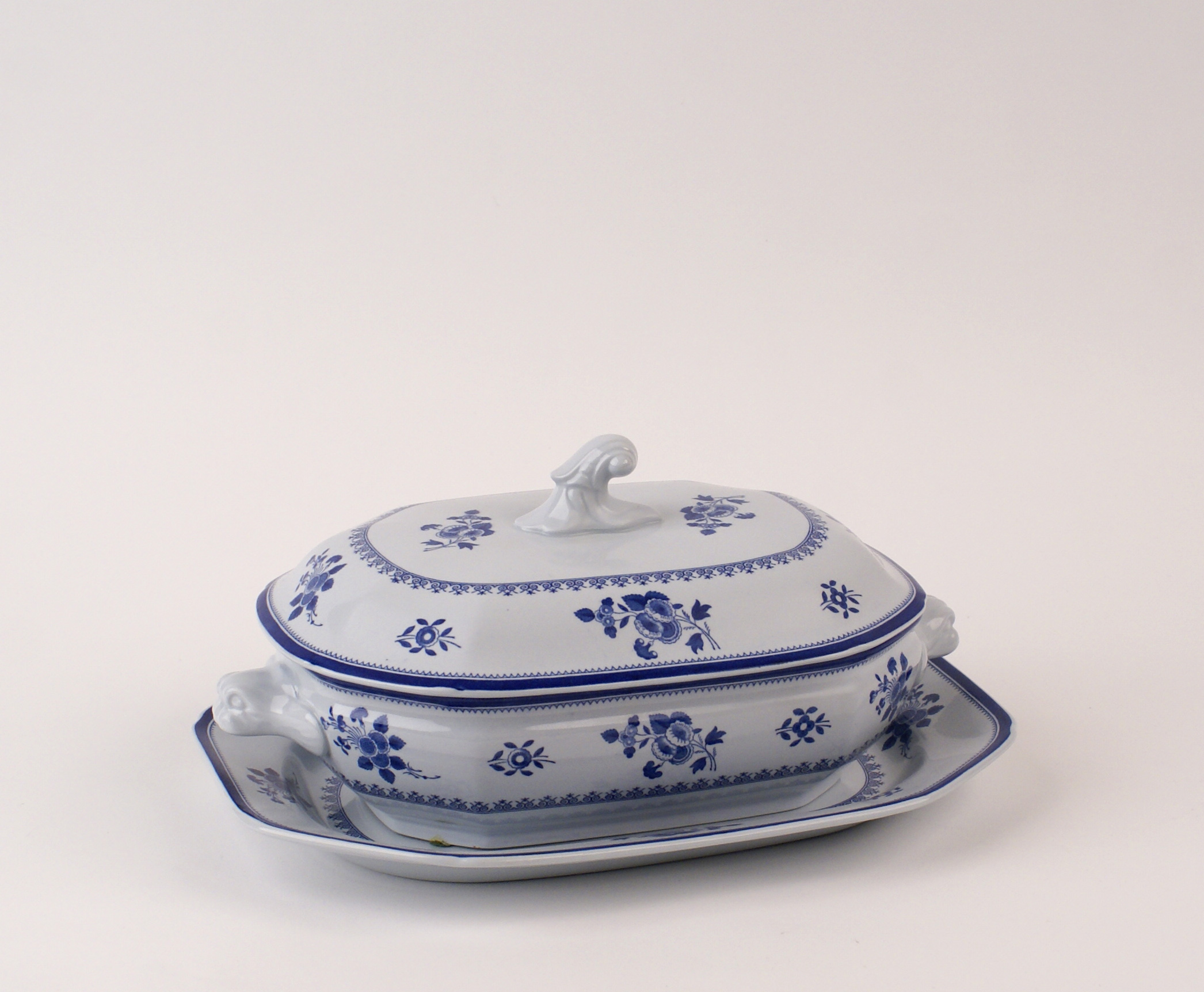 ZUPPIERA IN CERAMICA SMALTATA manifattura inglese e decorata a motivi floreali completa di sottopiatto 15x31x23 cm.