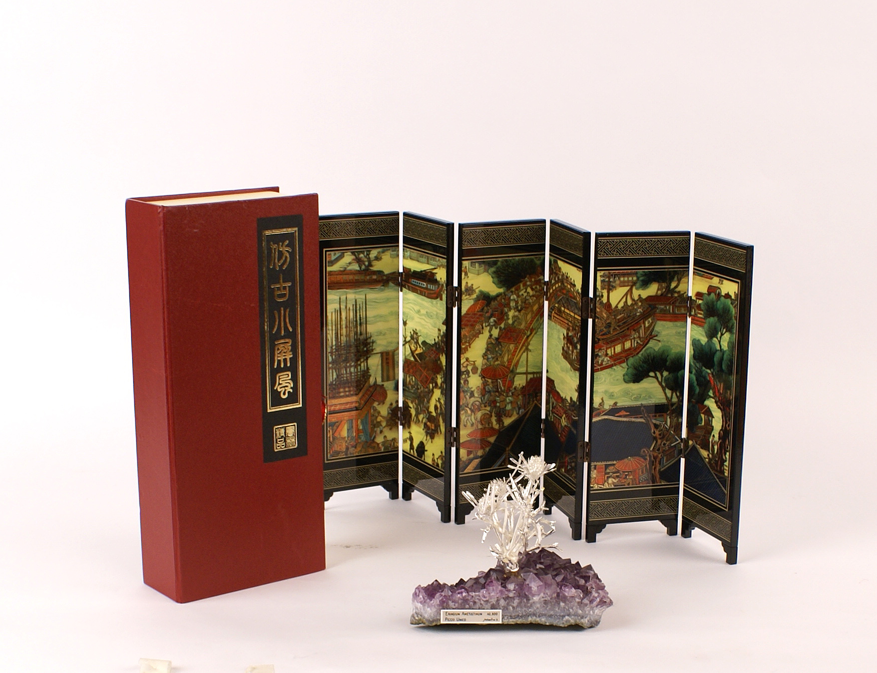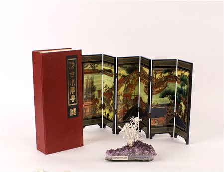 LOTTO DI 2 OGGETTI composto da un modello di paravento decorato a motivi orientali entro custodia e da una scultura in ametista e argento