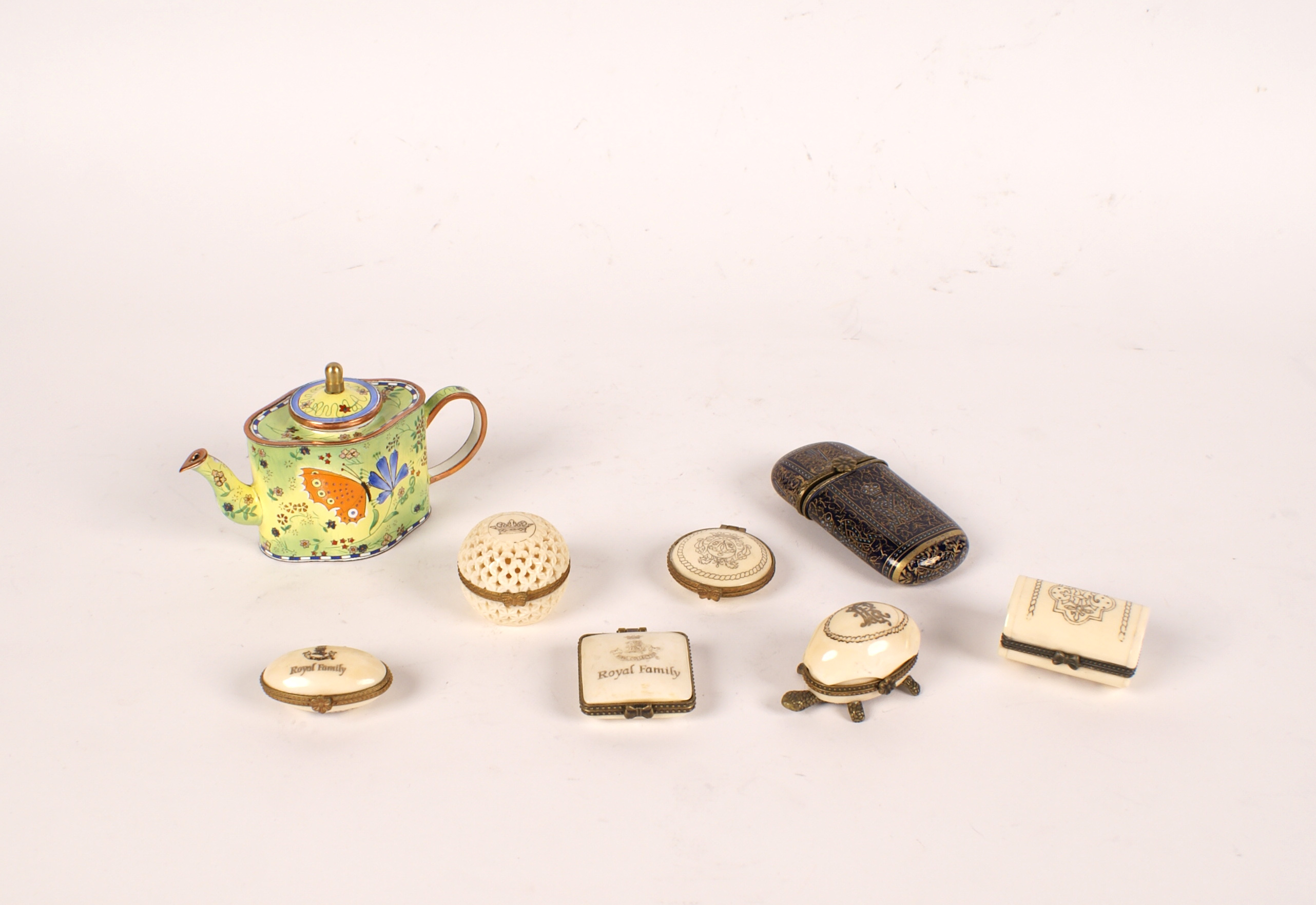 LOTTO DI 8 OGGETTI Inghilterra composto da sei porta pillole in osso , 1 porta aghi in porcellana e un modello di teiera in porcellana policroma