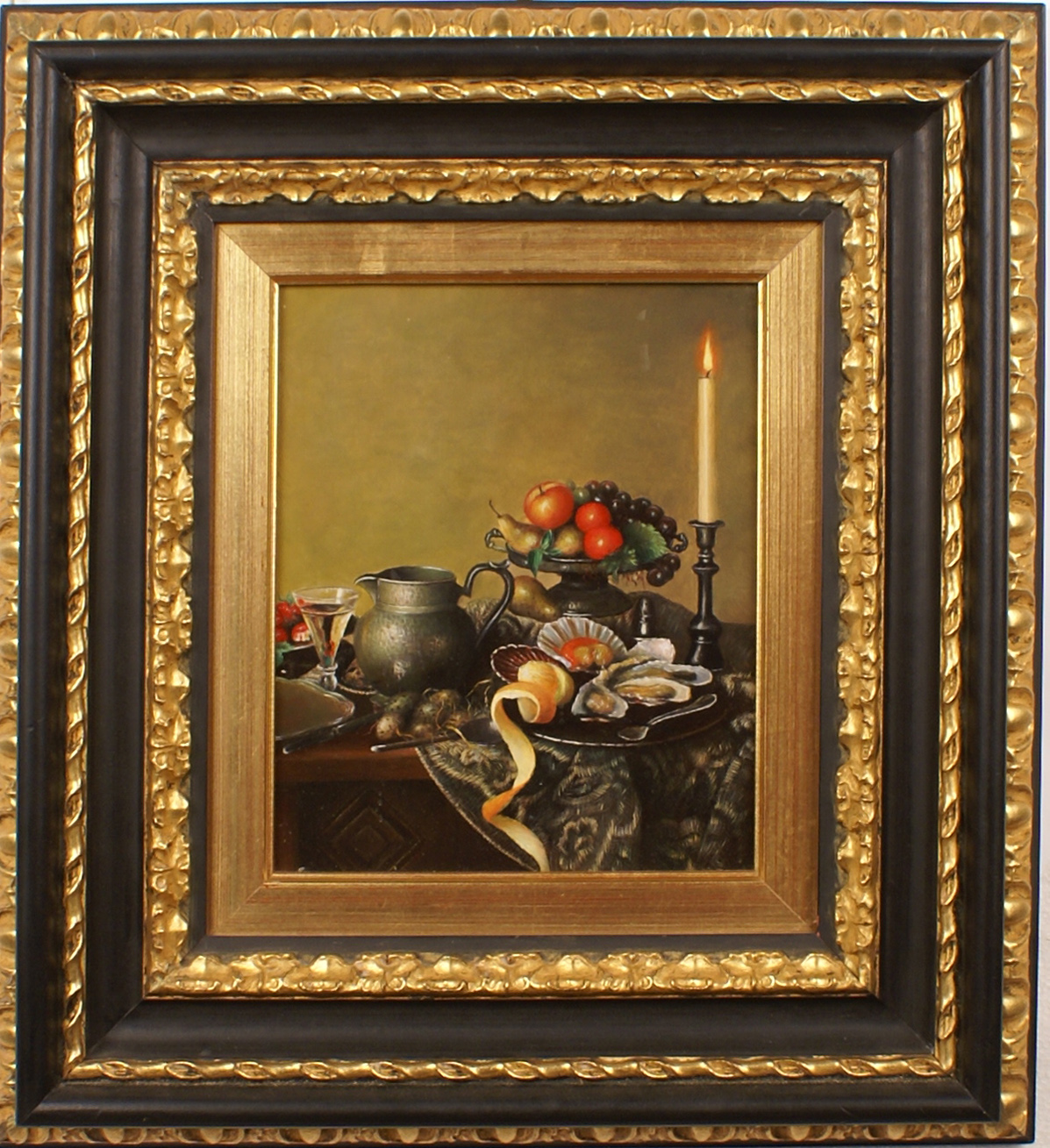 SCUOLA ITALIANA XX Sec. Natura morta di frutta e ostriche, olio su tavola, entro cornice 30x26 cm.