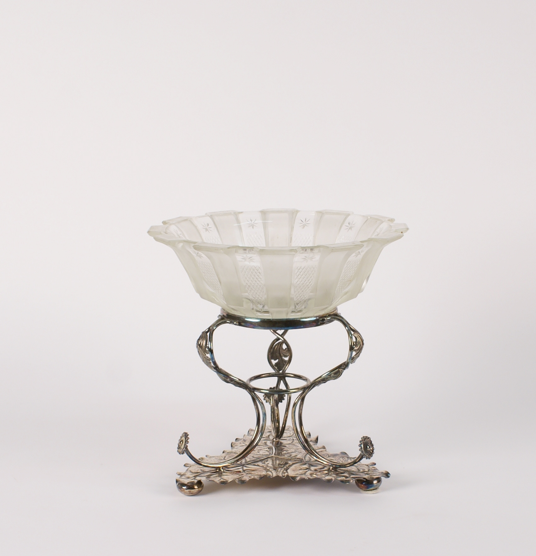 ALZATA CENTROTAVOLA Inghilterra vecchia manifattura coppa in cristallo molato poggiante su tre sostegni a motivi di volute e base a foglie 25x25 cm.