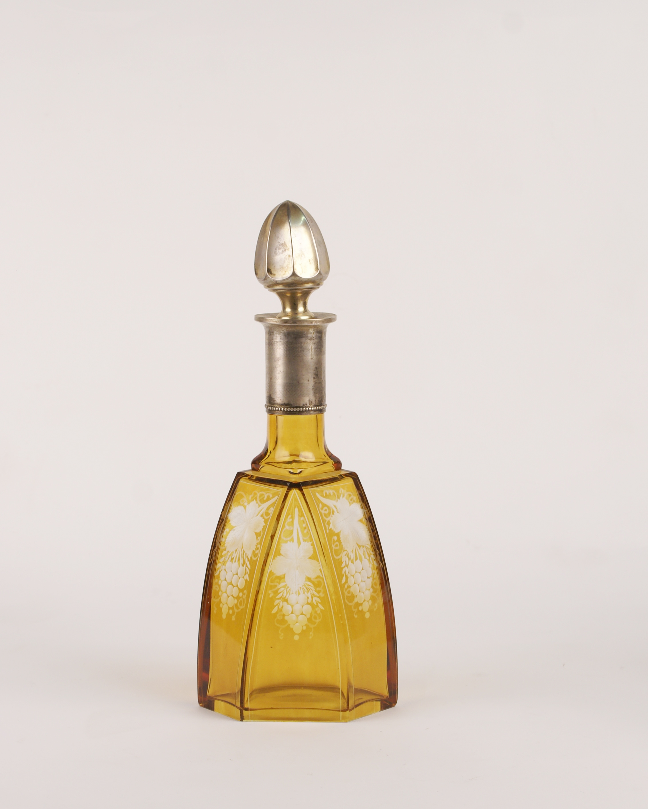 BOTTIGLIA DA LIQUORE vecchia manifattura in vetro inciso a motivi di grappoli d'uva e foglie di vite con tappo in argento h. 33 cm.