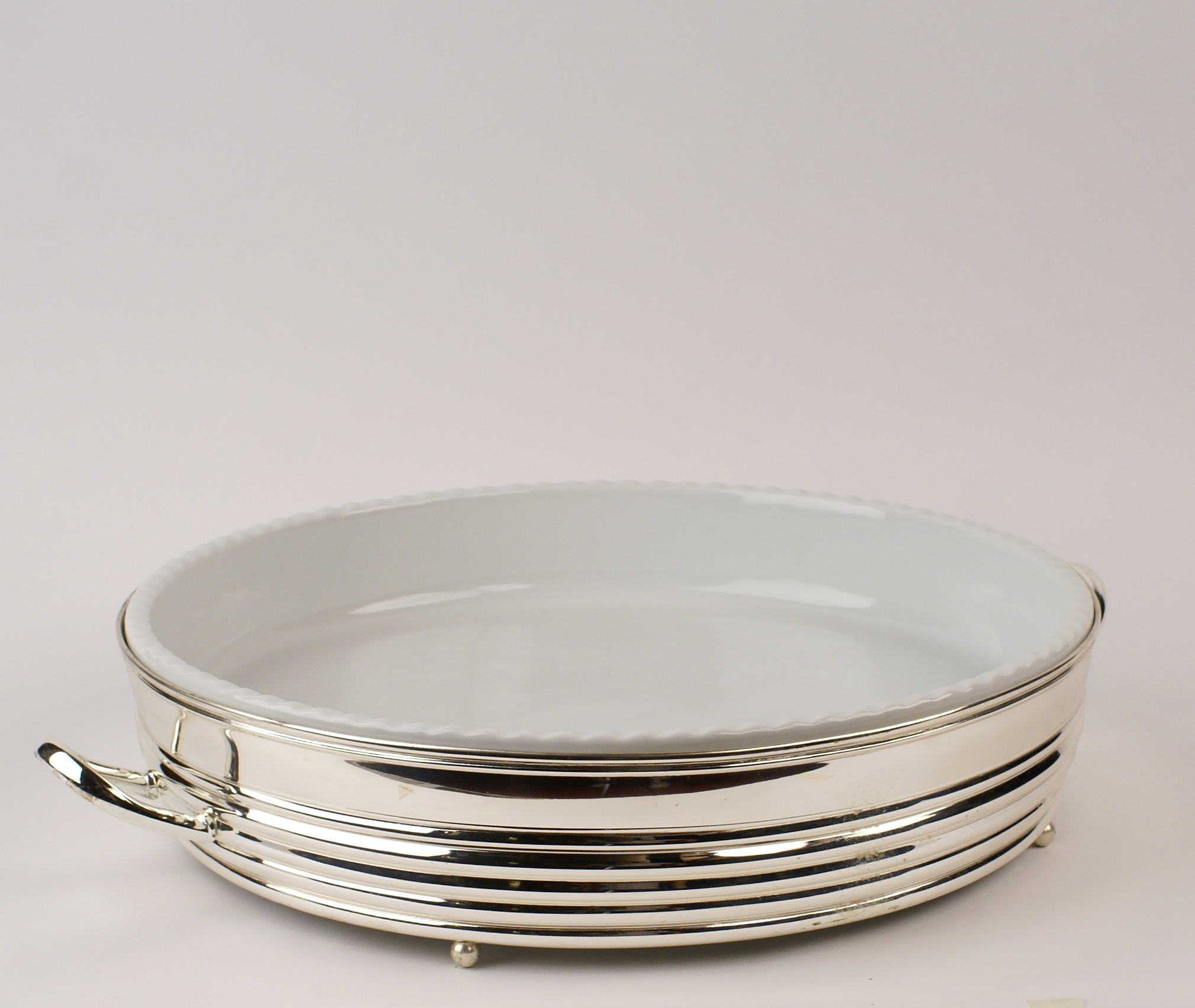GRANDE PIROFILA IN METALLO ARGENTATO a due manici poggiante su quattro piedini a sfera, interno in ceramica smaltata d. 51 cm.