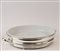 GRANDE PIROFILA IN METALLO ARGENTATO a due manici poggiante su quattro...