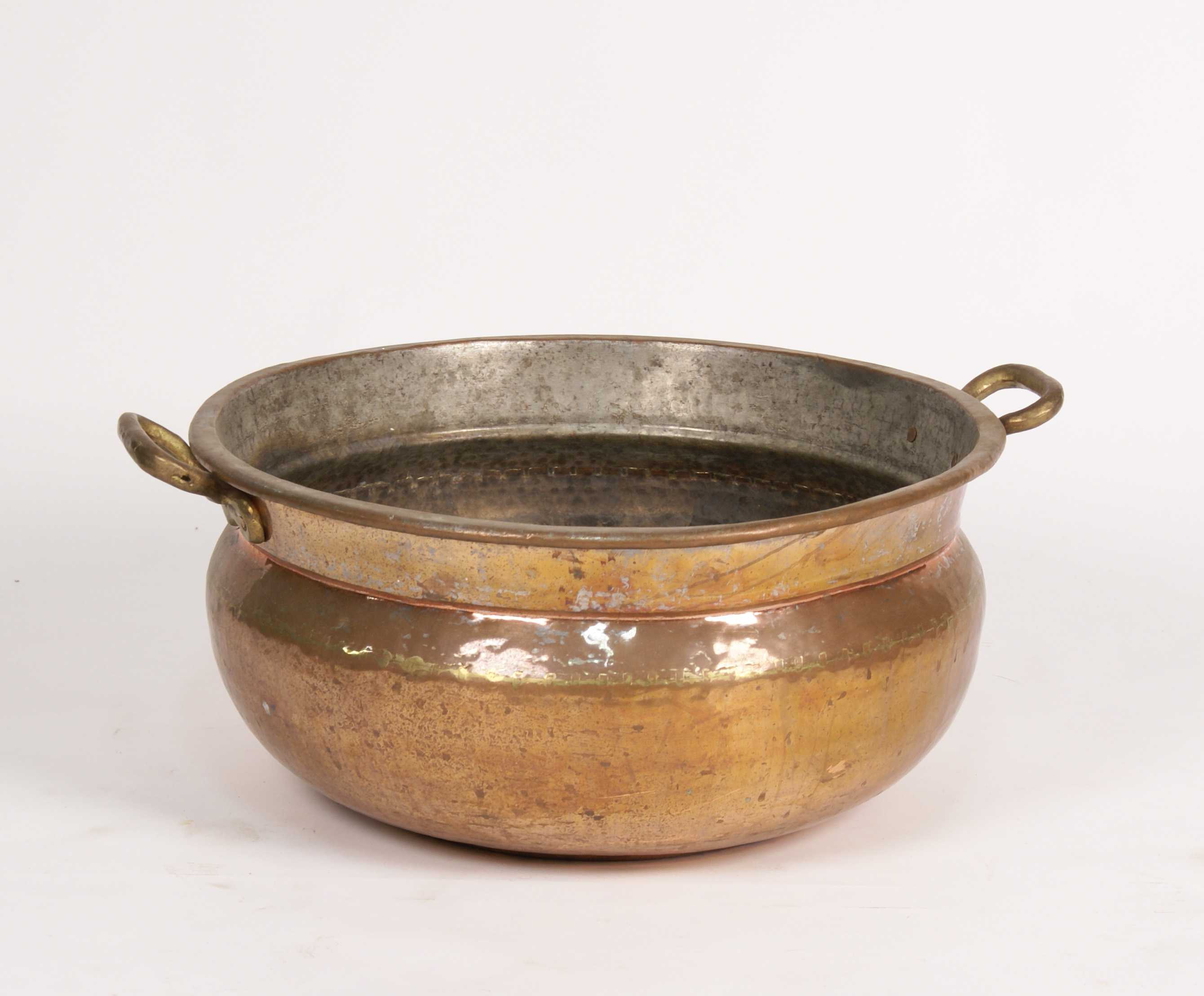GRANDE CACHEPOT IN RAME CON DUE MANICI vecchia manifattura 27x65 cm.