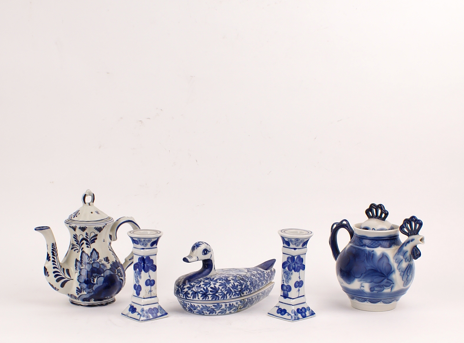 LOTTO DI CINQUE OGGETTI IN PORCELLANA BIANCA e blu cobalto fogge, manifatture...