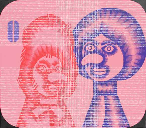 Concetto POZZATI Vò Vecchio (Pd) 1935 Burattini televisivi, 2004 Smalto e acrilico su tela cm 70 X 80 Autentica dell’Archivio Pozzati su fotografia, archiviata con n° 1945/10 Firma, data ‘Pozzati, 04’; etichetta dell’Archivio Pozzati (al retro)