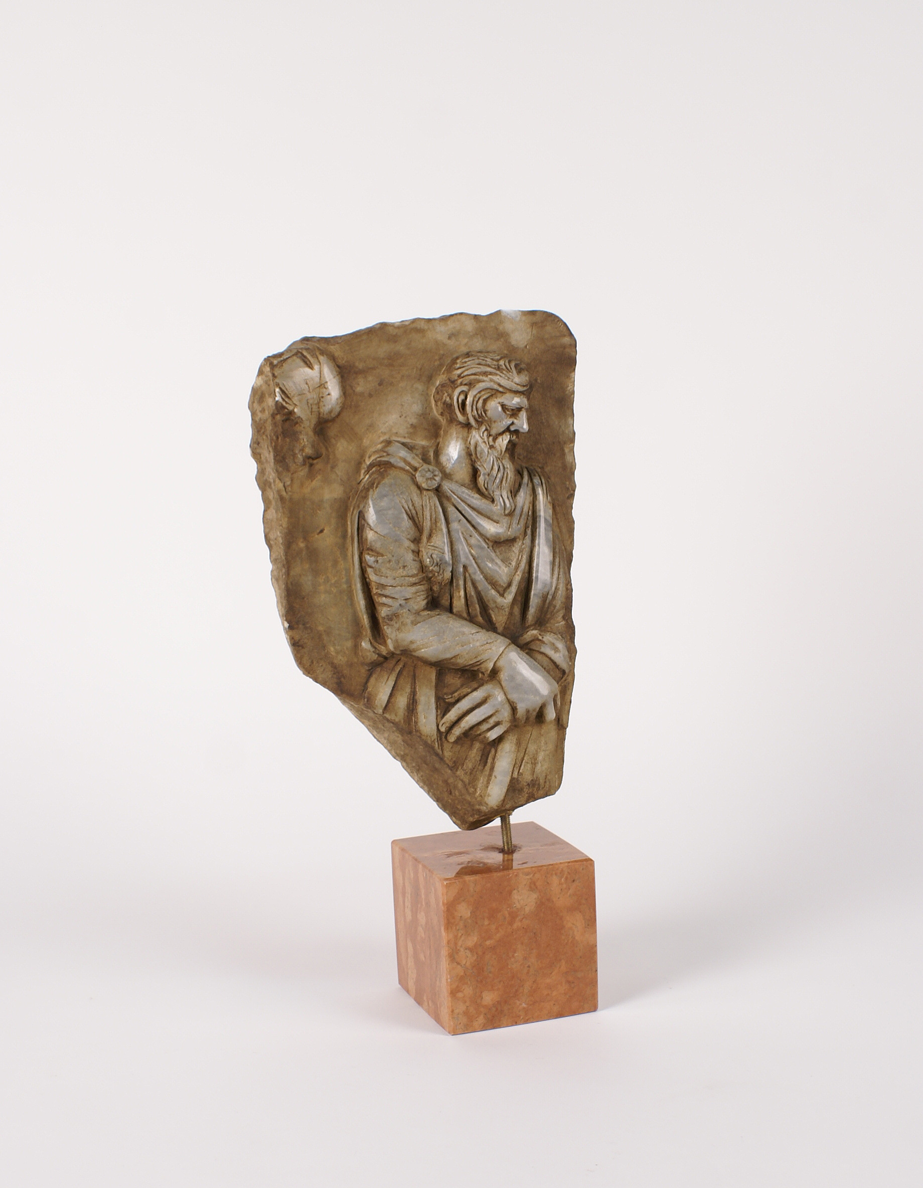 FREGIO IN MARMO vecchia manifattura scolpito ad altorilievo a raffigurare San Paolo poggiante su base squadrata in marmo rosso di Verona 35x17x8 cm.