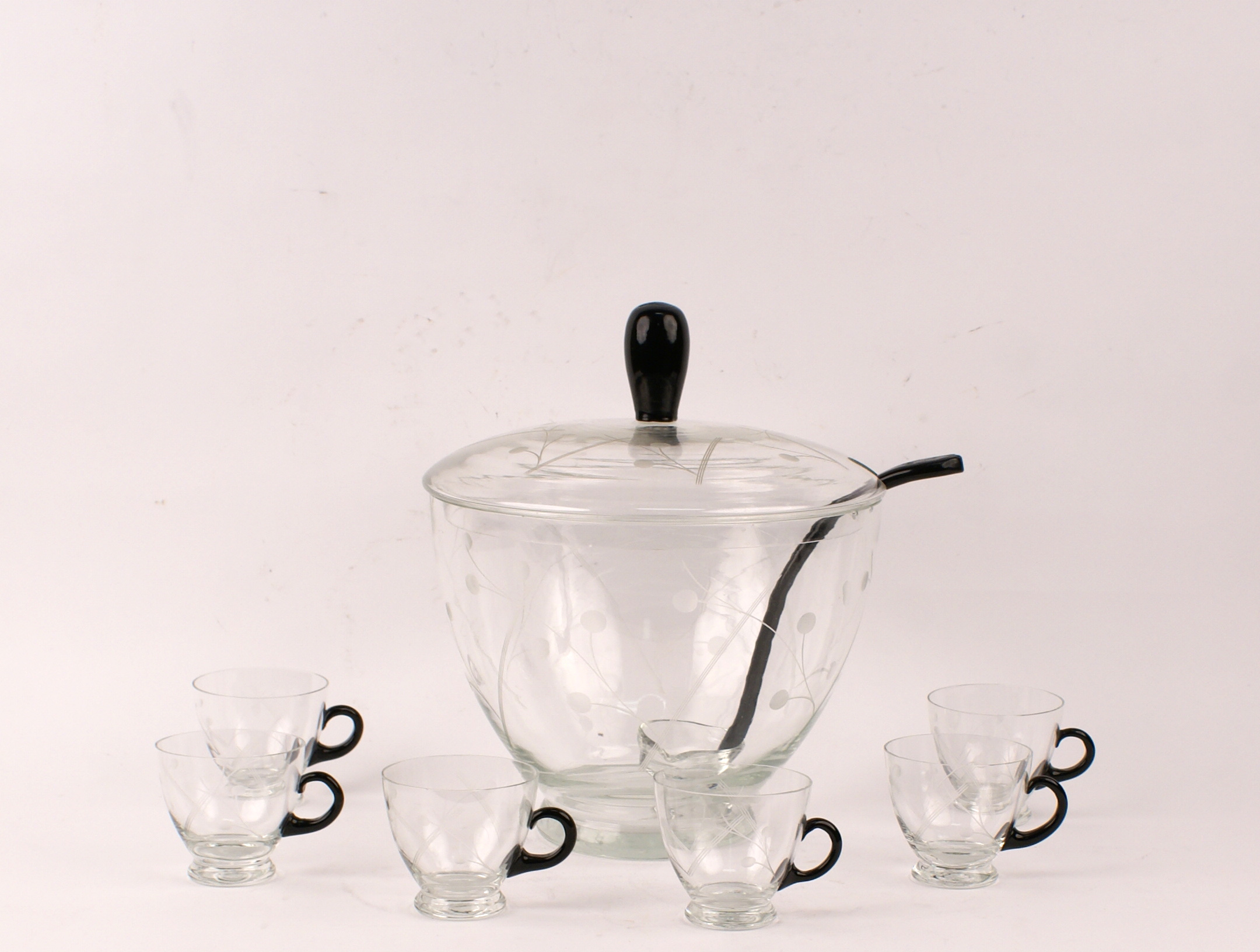 COPPA PER APERITIVI IN VETRO INCISO E TRASPARENTE vecchia manifattura completa di mestolo e sei bicchieri, prese in vetro nero (lievi difetti) h. 30 cm.