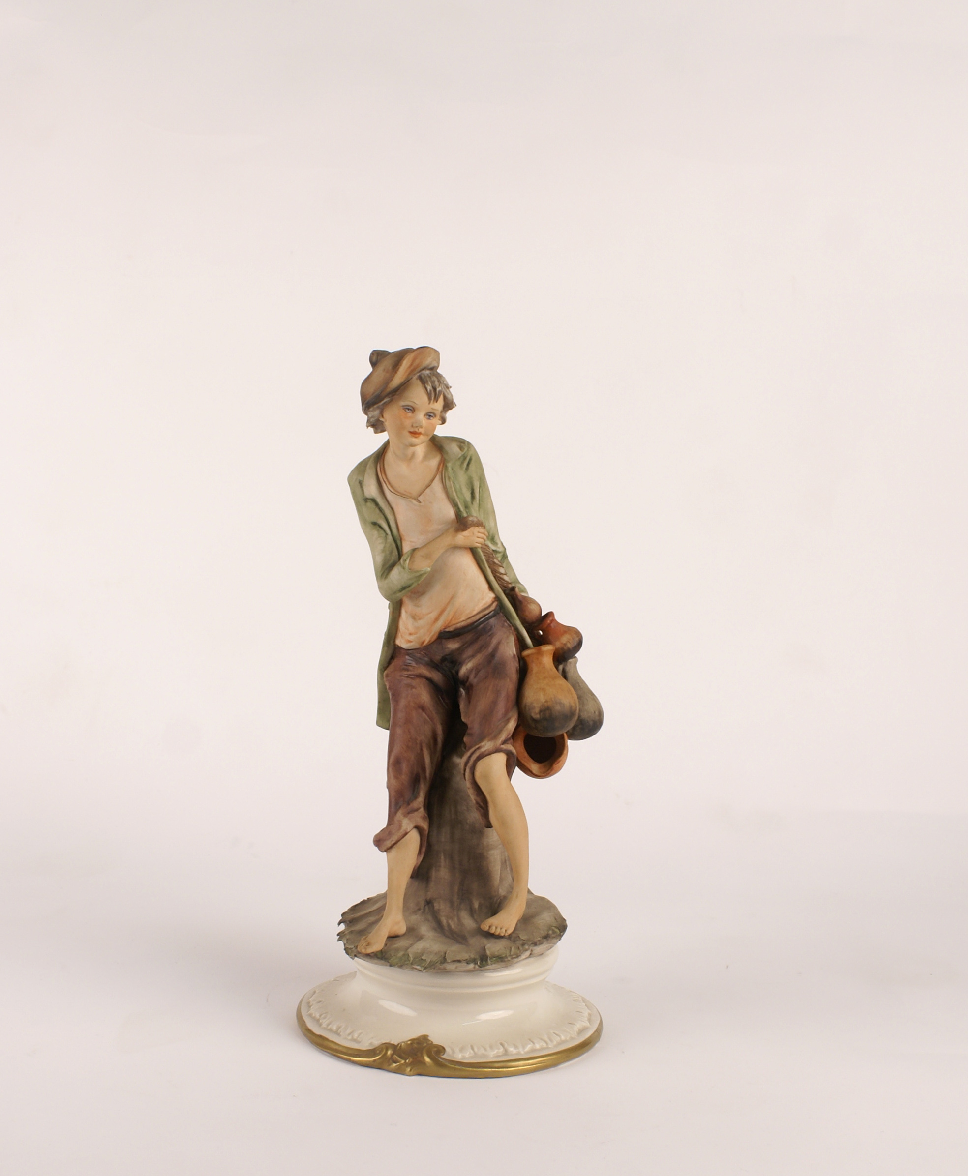 GRUPPO IN CERAMICA POLICROMA manifattura Capodimonte raffigurante un venditore ambulate e poggiante su base circolare h. 35 cm.