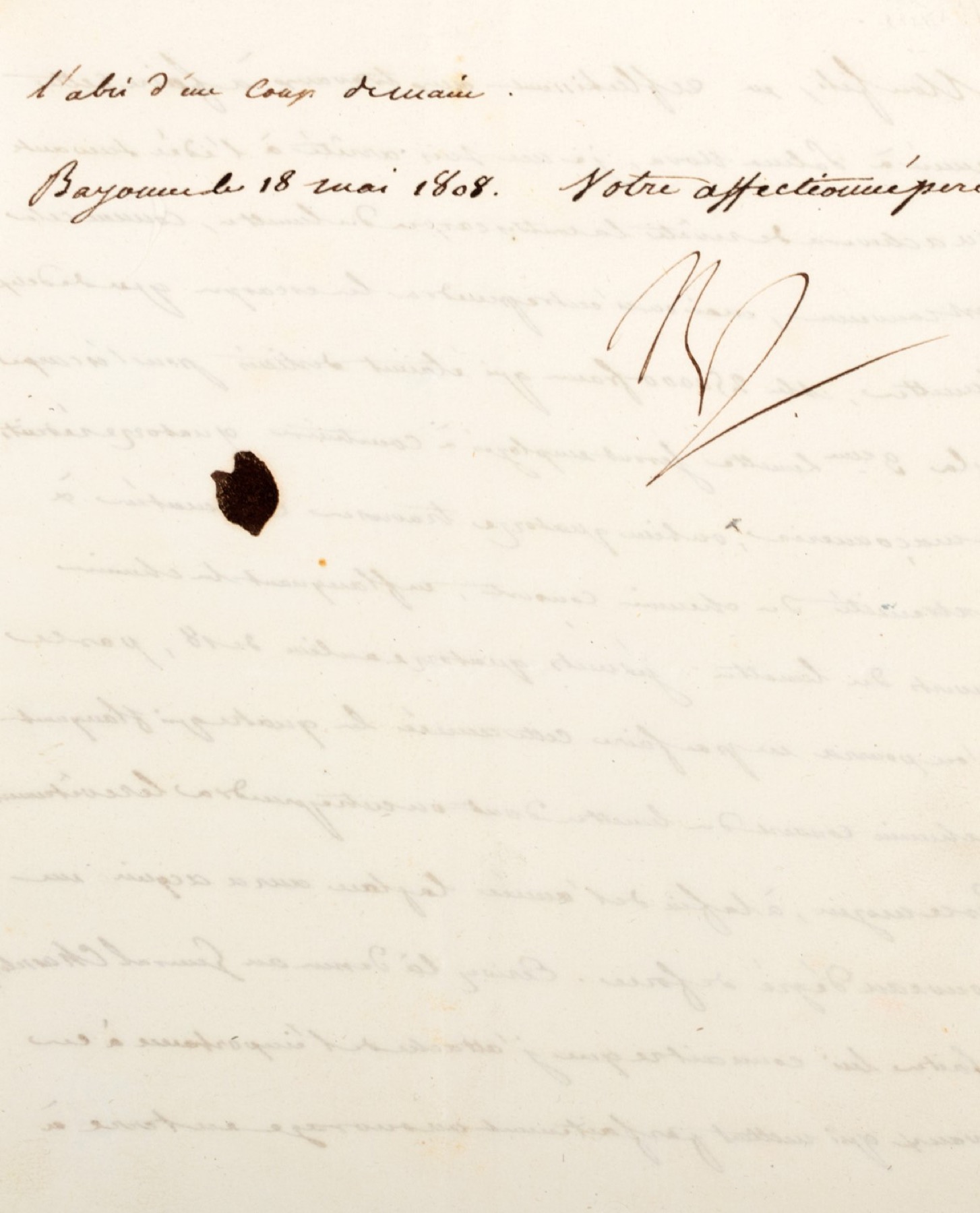 Lettera sottoscritta da Napoleone con la sua consueta firma, datata Bayonne 18 maggio 1808, in 4° una facciata e due righe al verso, 228 x 185 mm., indirizzata al Principe Eugène de Beauharnais, Viceré d'Italia.