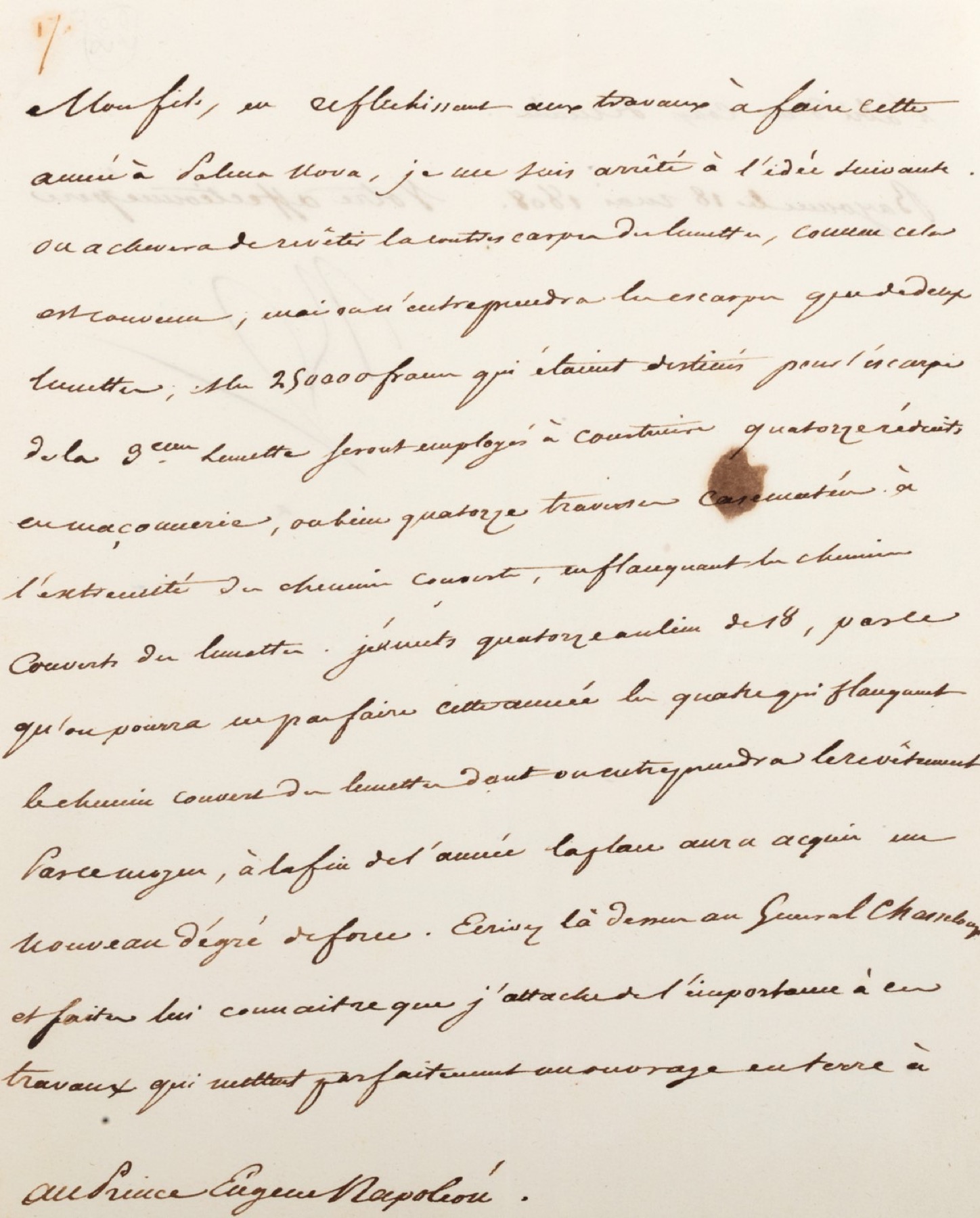 Importante documento avente ad oggetto i lavori delle fortificazioni di “Palma Nova”, in particolare delle famose “lunette” napoleoniche che a partire dal 1805 vennero erette all'esterno delle antiche fortificazioni venete per consolidare maggiormente la celebre città-fortezza. Il documento dimostra l’importanza che l’Imperatore annetteva a questa struttura, gemma dell’architettura militare di tutti i tempi, quale punto chiave del sistema difensivo del suo impero, ma anche la cura quasi maniacale di ogni dettaglio che Napoleone dimostrava per i più remoti lembi del suo dominio e la perfetta conoscenza dei termini e dettagli tecnici delle varie discipline.