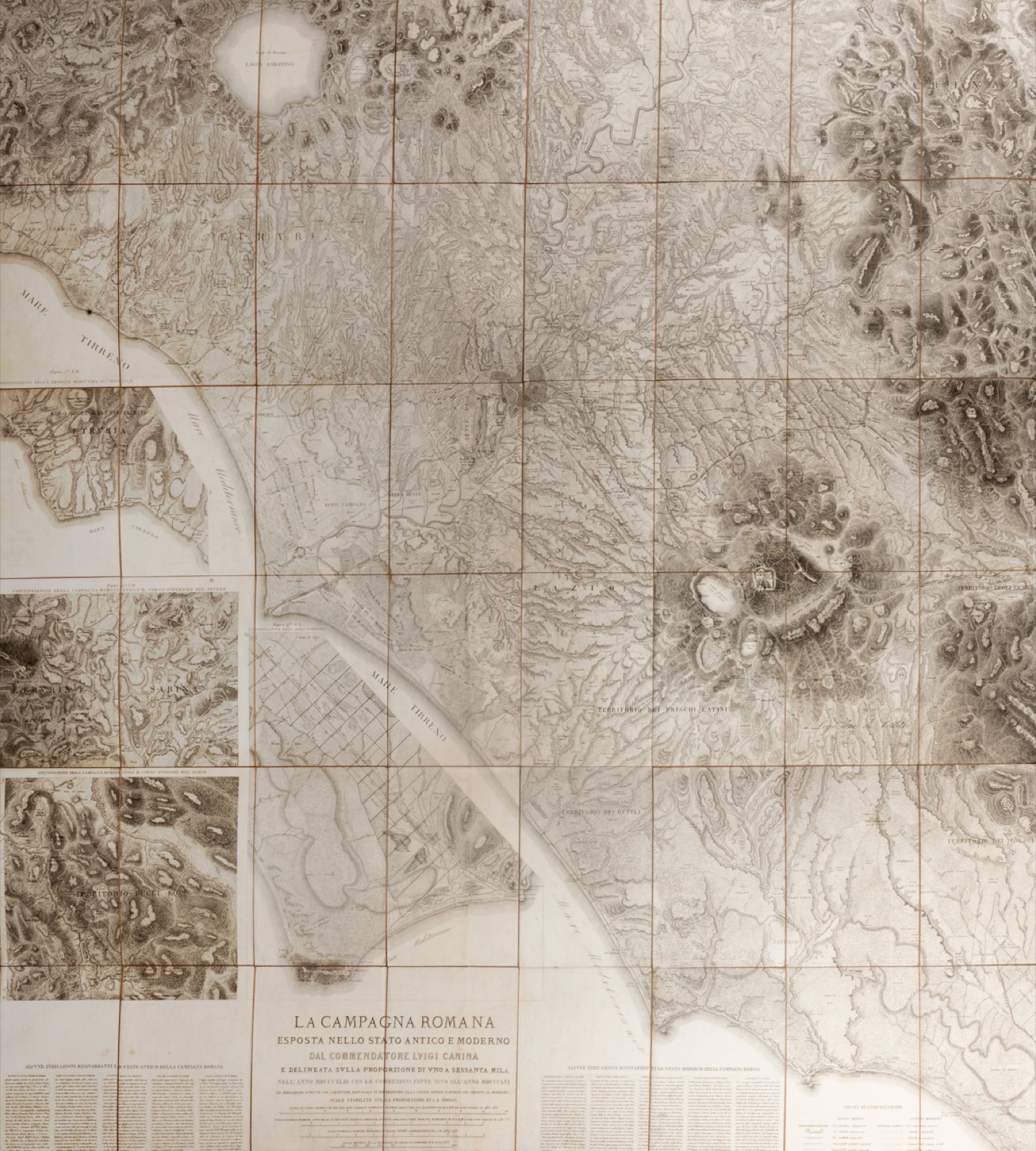 Grande carta della Campagna Romana su sei tavole datata 1856, 153 x 142 cm., montata su tela e contenuta in cofanetto apposito, unita lettera di accompagnamento di Canina che la dona ad una imprecisata signora.