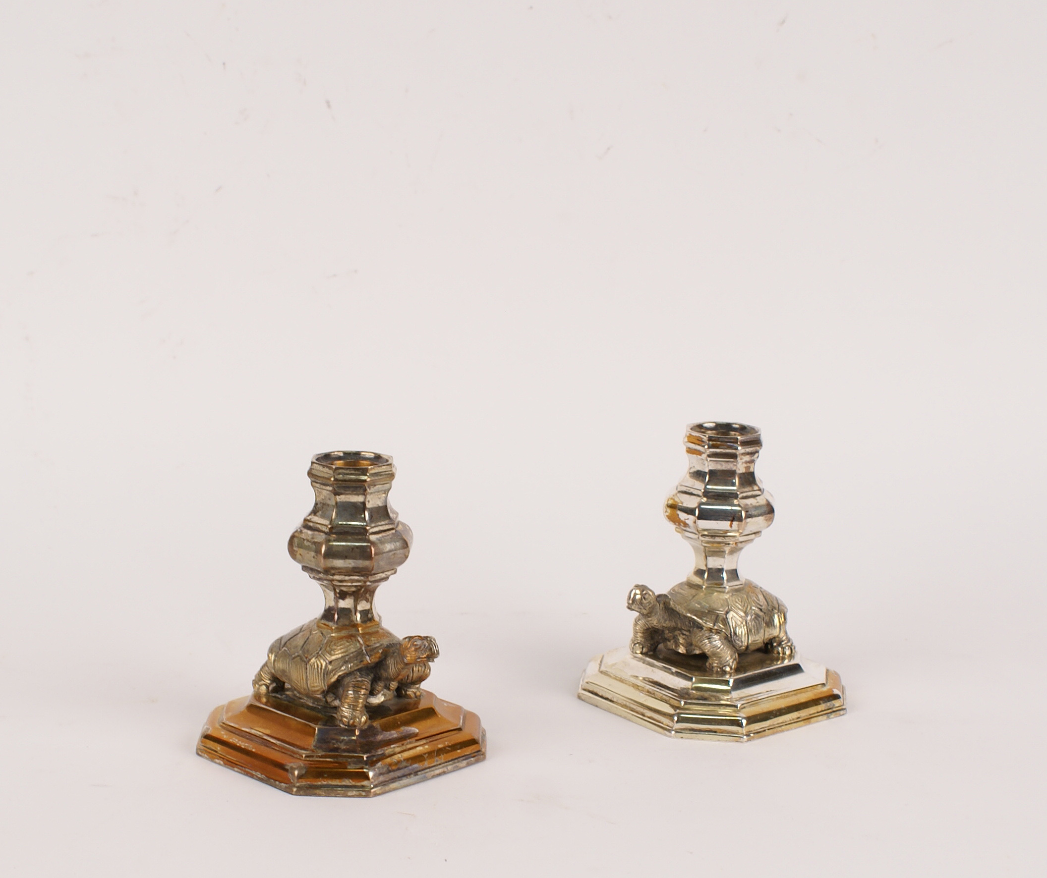 COPPIA DI CANDELIERI A TARTARUGA IN ARGENTO manifattura italiana poggianti su...
