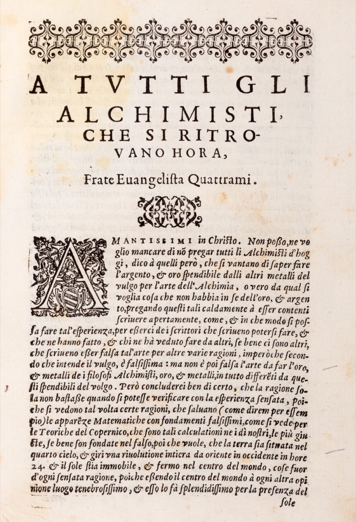 Prima edizione di questo trattato contro la falsa e ingannevole alchimia dei contemporanei, distinguendola dalla vera che non viene praticata allo scopo di ottenere facili guadagni e comporta studi assidui e impegnativi. Evangelista Quattrami (1527 -1608) naturalista botanico era entrato nell’Ordine degli eremiti di S. Agostino. Dopo aver conseguito il dottorato in teologia, si dedicò alla ricerca e allo studio delle erbe medicinali con numerose escursioni naturalistiche in varie regioni italiane. Nella sua attività di semplicista e distillatore fu al servizio del cardinale Luigi d'Este. Si appassionò inoltre allo studio della medicina e dell’alchimia e pubblicò un trattato sulla preservazione e cura della peste.