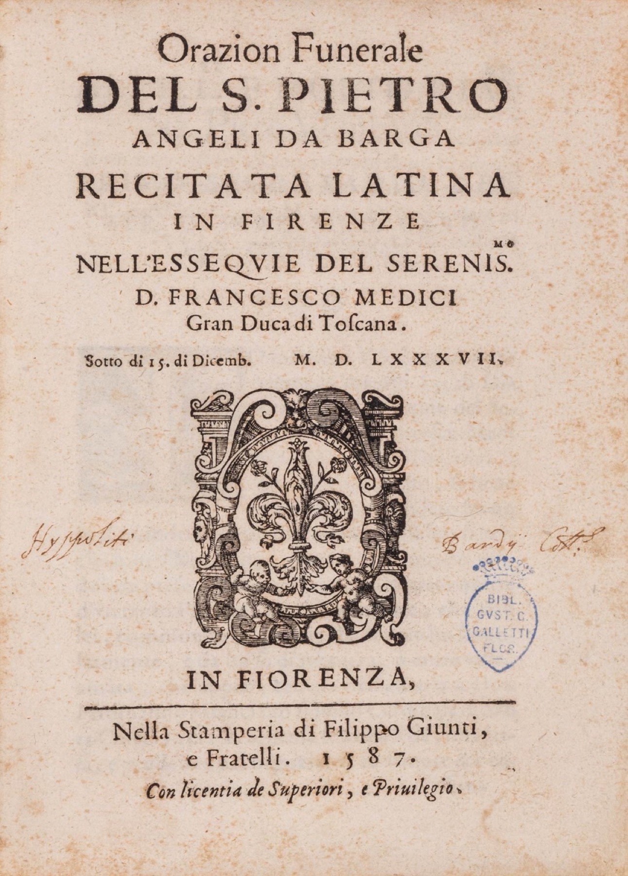 Firenze, Giunti, 1587. In 4°. Marca xilografica al titolo, capilettera incisi su legno, leggera gora d'acqua al frontespizio, legatura in cartoncino floscio. § Pietro Angeli. Oratio [...], Florentiae habita in funere Francisci Medicis. Firenza, Giunti, 1587. In 4°. Marca tipografica al frontespizio, bel capolettera figurato, leggere arrosature, legatura in cartonato moderno. §Pietro Angeli.Orazion Funerale [...]nell'essequie del Sernis. D. Francesco Medici Gran Duca di Toscana. Firenze, Filippo Giunti, 1587. In 4°. Marca xilografica al titolo ed in fine volume, capilettera incisi su legno figurati, fioriture sparse e qualche arrossatura, legatura in cartoncino floscio moderno. Firma di appartenenza al frontespizio e timbro della Biblioteca Galletti.