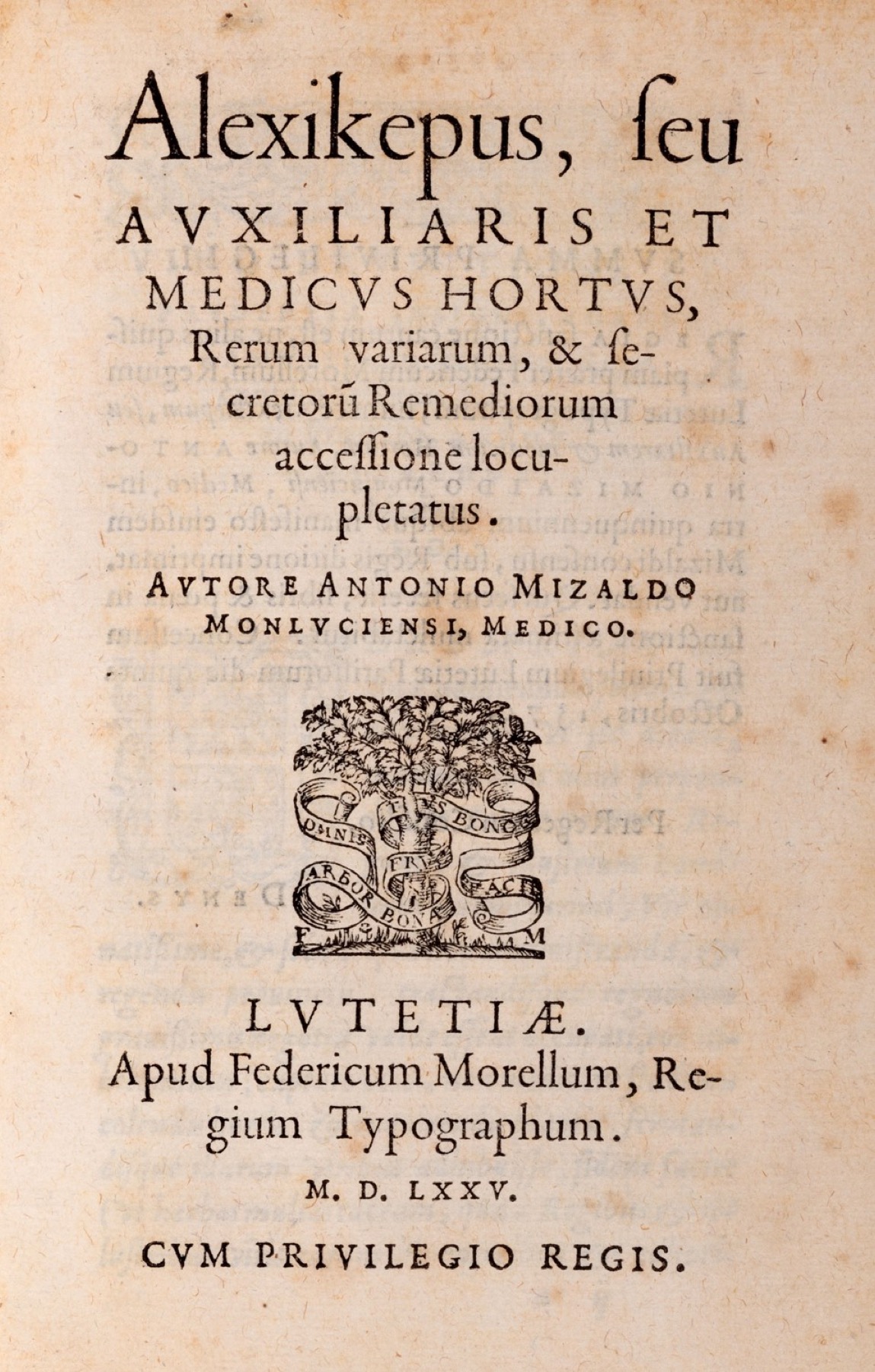 Seconda edizione (la prima è del 1574) di questo trattato sui giardini, la coltivazione di piante, fiori, erbe e alberi del fisico e astrologo francese Mizauld (1510-1578) seguito da due opere dello stesso autore.