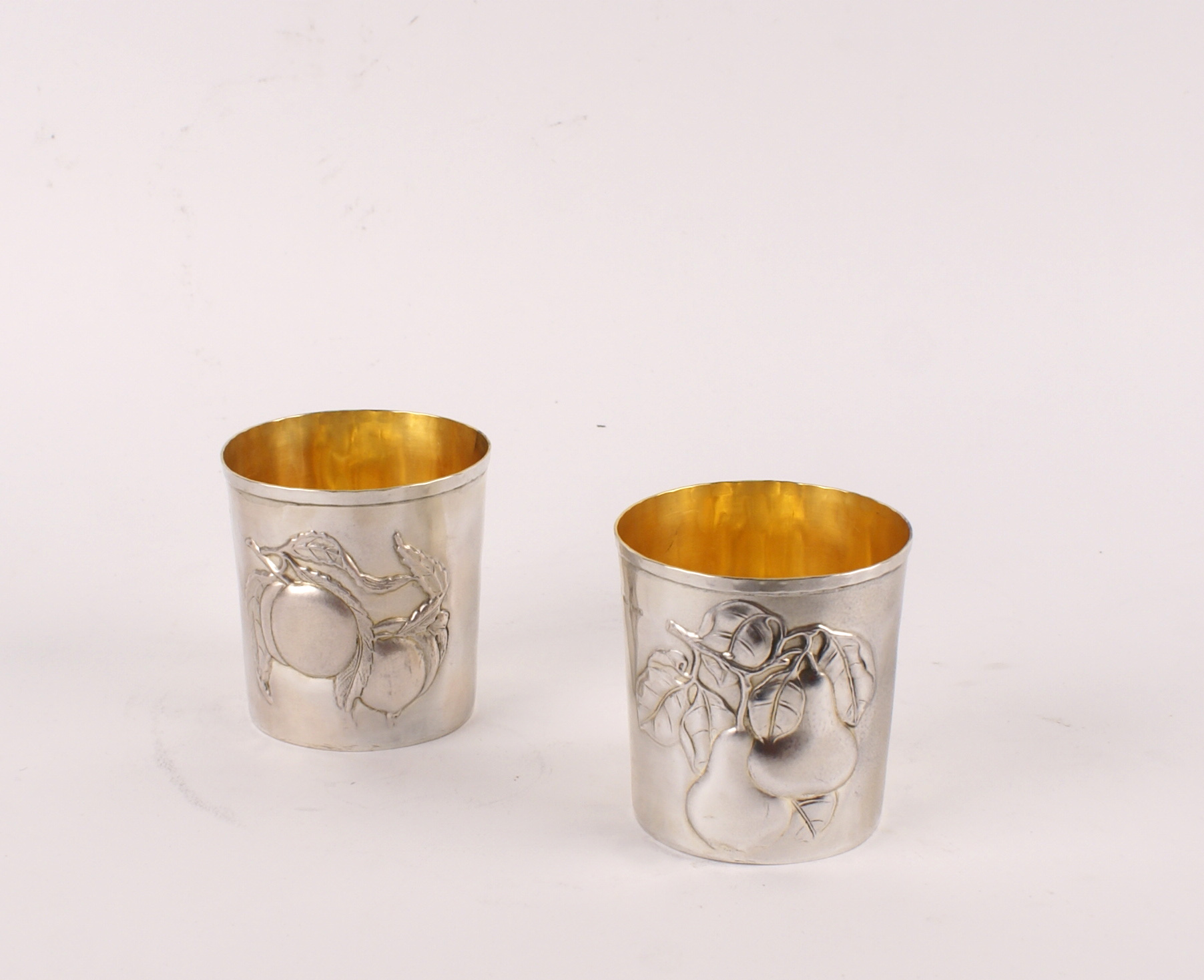 COPPIA DI BICCHIERI IN ARGENTO Firenze manifattura Brandimarte sbalzati a motivo di frutta, interno in vermeil, h. cm. 8 280 gr.