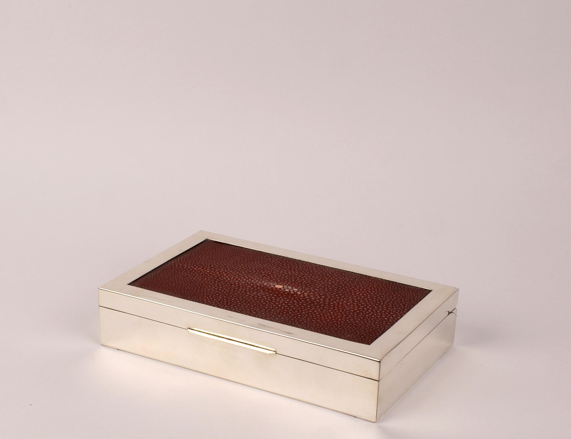 SCATOLA RETTANGOLARE IN LEGNO E ARGENTO manifattura Fabio Salini Roma coperchio parzialmente rivestito in pelle di rettile 4,5x21x13 cm.