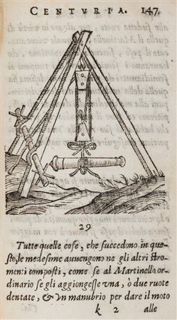 Prima edizione di questo interessante trattatello diviso in 3 centurie: nella prima si tratta della costruzione e della difesa delle fortezze, nella seconda della difesa ed espugnazione, nella terza dell'artiglieria. Vinciana 1449.