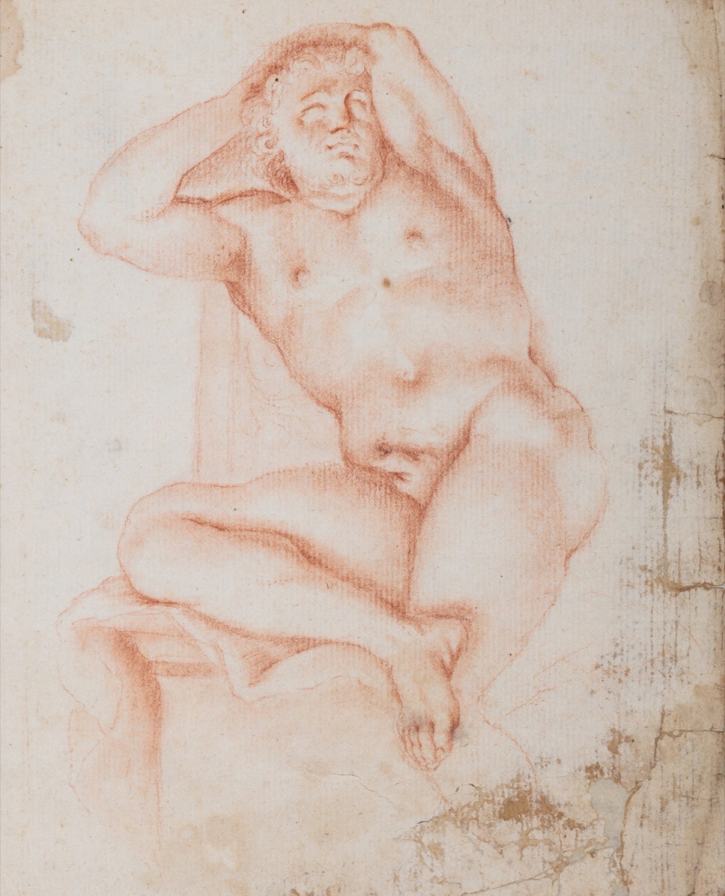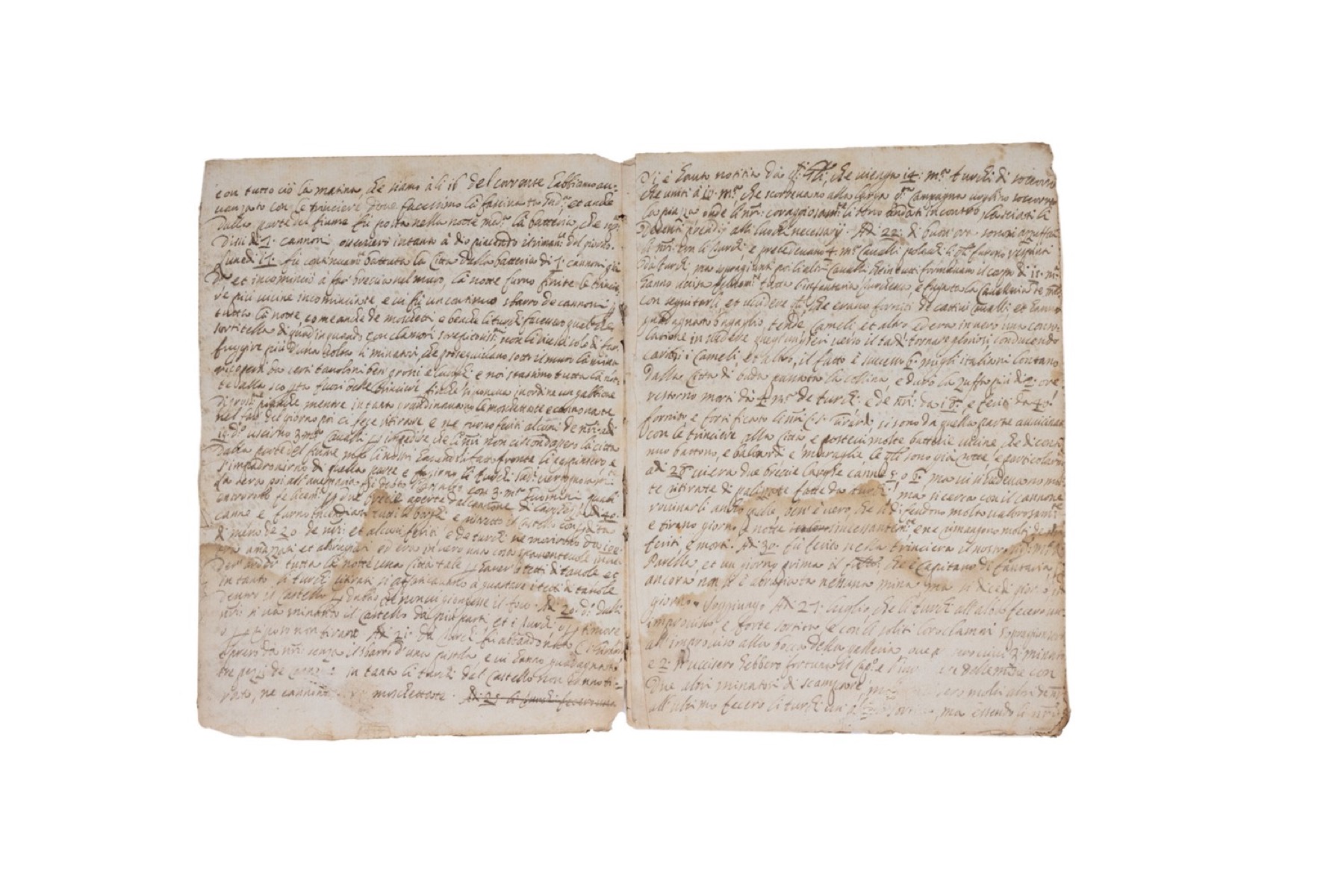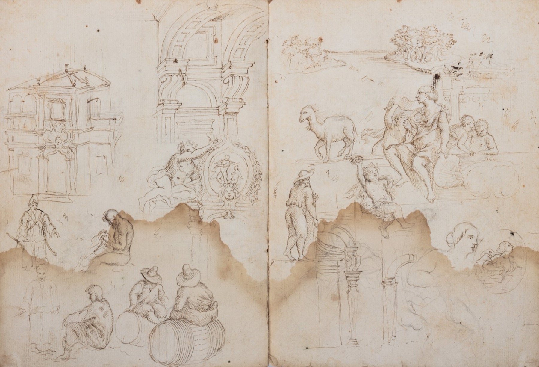Manoscritto cartaceo composto da 11 carte racchiuse in un cartoncino, 215 x 170 mm., recante alle prime 4 carte disegni in sanguigna di corpi nudi distesi, quindi alle 4 pagine successive un resoconto dettagliato dell'Assedio di Buda, a seguire altre 8 pagine con finissimi disegni a china e una sanguigna finale. all'ultima carta altro breve resoconto di mano diversa delle vicende di Buda, i disegni occupano anche le due facciate della legatura, strappetti, delicati restauri alle prima carte, margini consunti, aloni di umidità.