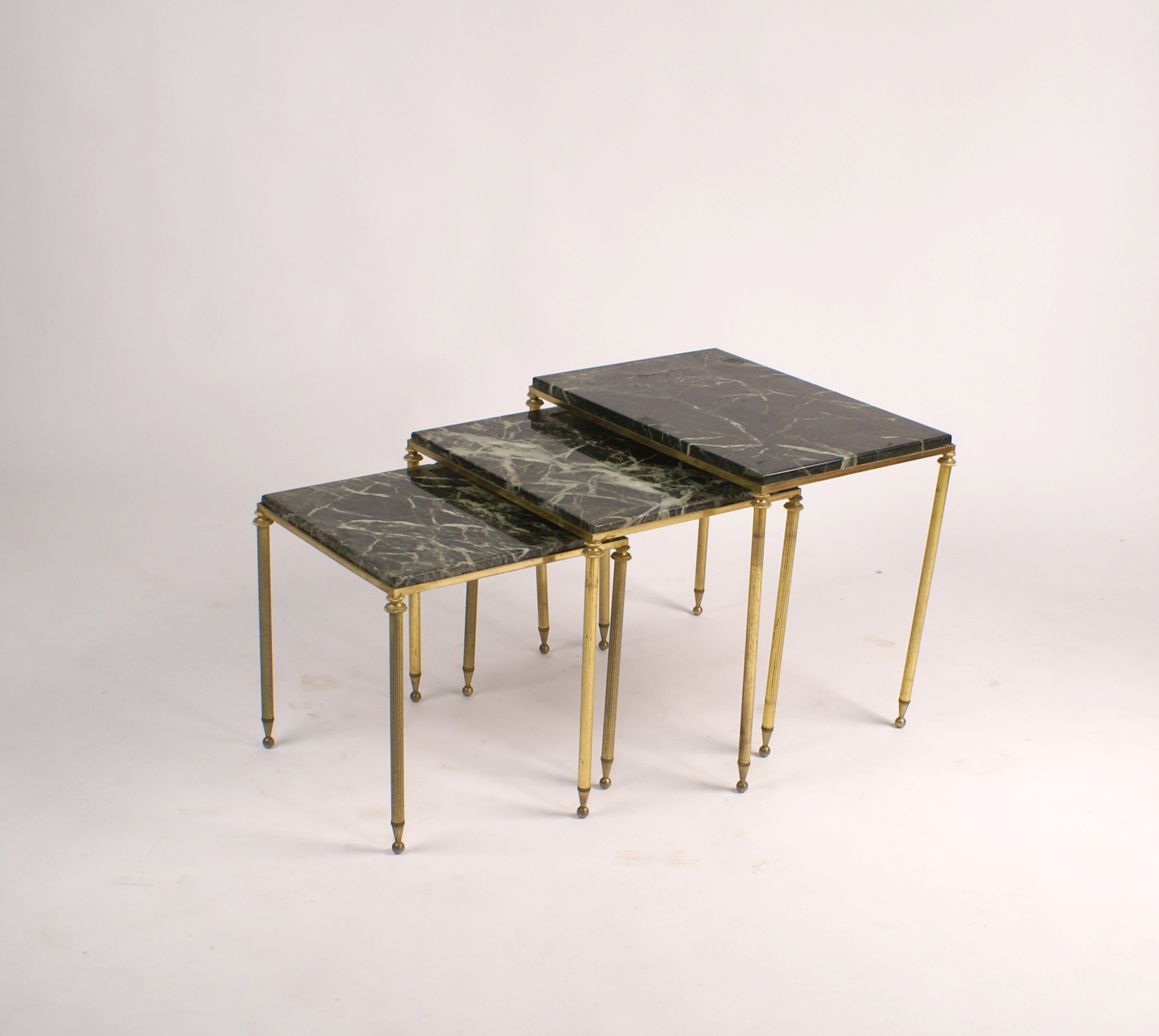 TAVOLINO A NIDO IN BRONZO DORATO Francia vecchia manifattura piani rettangolari in marmo verde poggianti su gambe scanalate