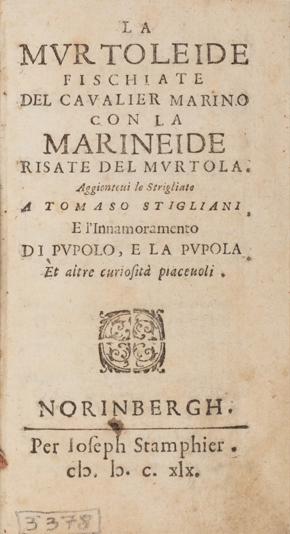 Prima edizione del feroce diverbio tra il Marino e Gasparo Murtola, il poeta genovese segretario del duca, che si concluse con un attentato alla vita del Marino e la condanna a morte del Murtola, poi graziato. Iniziano con proprio occhietto a c. D7r La Marineide, di Gasparo Murtola e a c. G10r Le strigliate a Tomaso Stigliani, di Andrea Barbazza. Vinciana 2964.