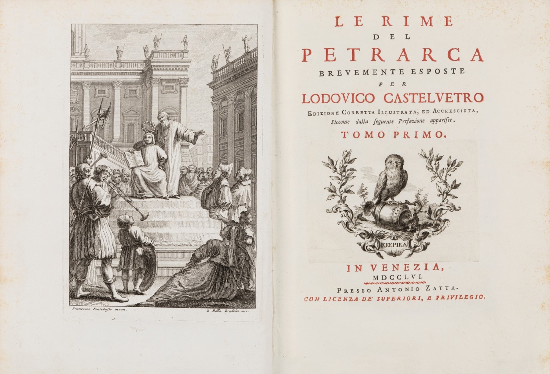 Pregevole edizione del capolavoro petrarchesco con ottimo ed esaustivo commento alle liriche del Canzoniere, i Trionfi, molte giunte, la vita del poeta scritta dal Castelvetro, diversi apparati ed altra utile documentazione. Le pertinenti e fini illustrazioni originali di Leonardis, Brustolon, Zompini ed altri incisori impreziosiscono quest'opera lodata a suo tempo per la correttezza e nitidezza formale. Gamba, 735 che cita il Marsand: ''questa edizione [...] per la diligenza somma con cui è stata fatta, e per gli ornamenti, e pe' caratteri, e per la correzione dovrà sempre tenersi in grandissima stima; e già n'è indubitata prova la difficoltà di rinvenirne gli esemplari''; Brunet, IV, 554: ''cette edition etait la plus belle et l'une des meilleures que l'on eut alors de ce poete''. Morazzoni, 248. 2 1756