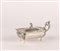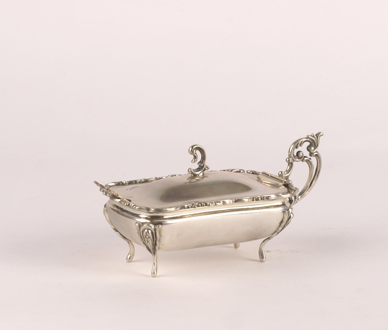 FORMAGGIERA IN ARGENTO CON CUCCHIAINO vecchia manifattura italiana a corpo liscio, poggiante su quattro piedini a voluta, interno in vetro, cm. 9,5x18 260 gr.
