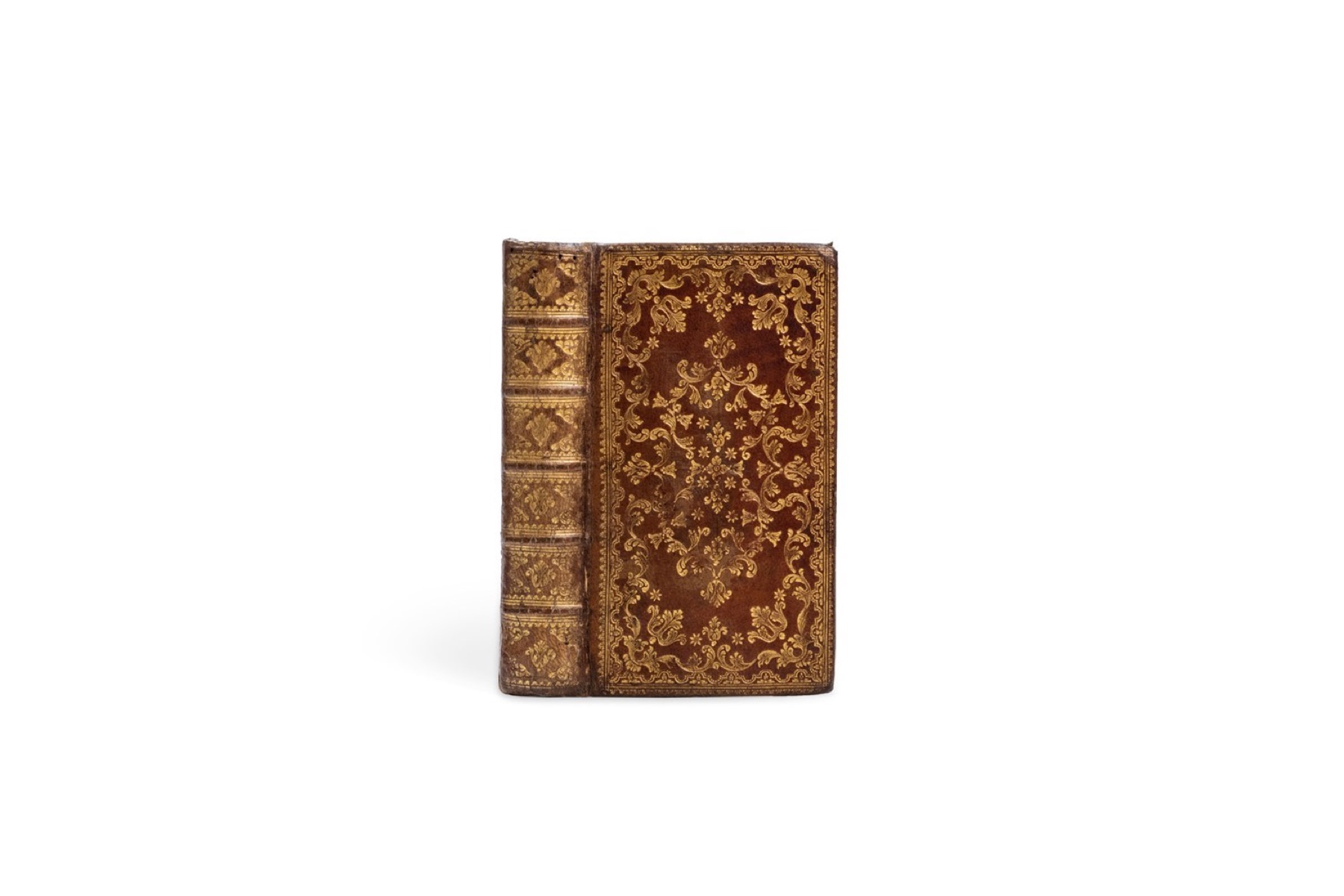 Roma, Gioacchino e Gian Giuseppe Salvioni, 1766. 2 parti in un vol. In 12°. Testo stampato in rosso e nero, 7 tavole incise in rame nel testo, qualche lieve fioritura, legatura coeva in marocchino color nocciola riccamente impresso in oro con rotelle ed elementi fitomorfi, dorso a 5 nervi impresso in oro, dentelles, tagli dorati e punzonati, 5 minuscoli fori di tarlo vicino alla cuffia superiore.