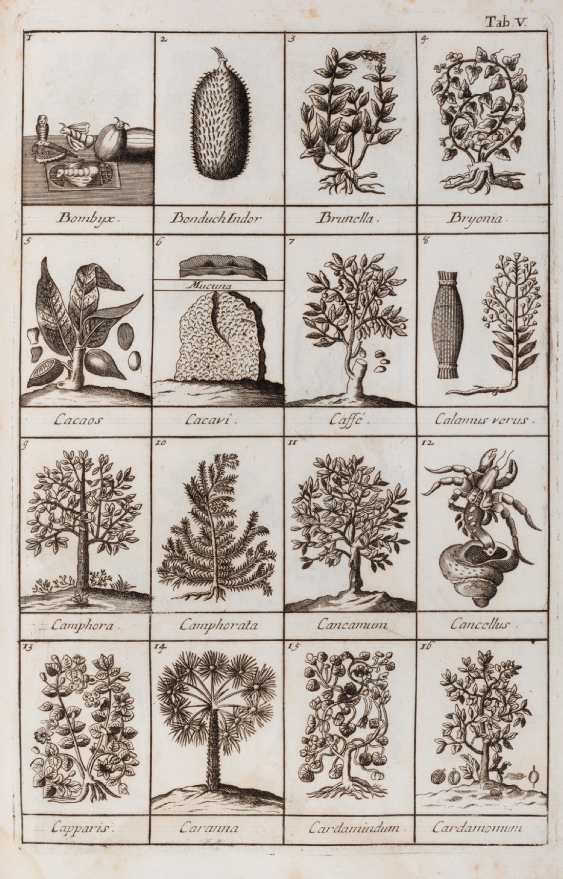 Venezia: Hertz, 1721. In 2°. Frontespizio con ampia vignetta calcografica, testo su due colonne, completo delle 25 tavole fuori testo ciascuna divisa in 16 comparti recanti illustrazioni di piante o animali, marginali fioriture, leggera gora d'acqua, lavoro di tarlo al margine interno dei primi fascicoli fino a A4, piccole tracce di cera al verso di D5 e D6, strappo restaurato alla tavola XVII, ultimo fascicolo leggermente allentato, rinforzi alla prima e ultima carta bianca, legatura coeva in pergamena rigida, autore e titolo manoscritti al dorso a 5 nervi con piccolo tassello cartaceo, piatto anteriore parzialmente staccato e piatto posteriore staccato, difetti al dorso, lievi aloni. Ex libris manoscritto alla carta di guardia.